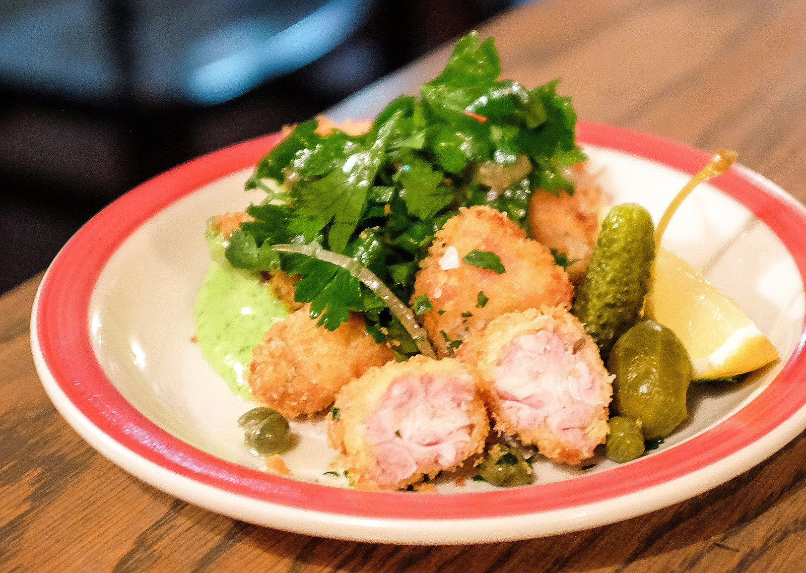 Game for game: Crispy lamb brains with parsley mayo & lemon; pheasant broth with confit pheasant, hominy, wilted greens & mushrooms; smoked local kahawai fish with white beans, creme fraiche, olives & capers; saffron pappardelle with goat ragu; & sherry-braised boar shoulder with chestnuts, Jerusalem artichokes, kale & pancetta - a hearty meal of meat for a rainy night.