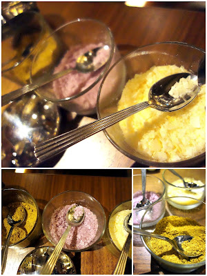 The restaurant supplies a trio of signature salts to pair with the food: Red wine salt goes with meat, smoked salt with chicken & veggies, while lemon salts for seafood. Wheres the remainder of that menu? A tale for another time.
