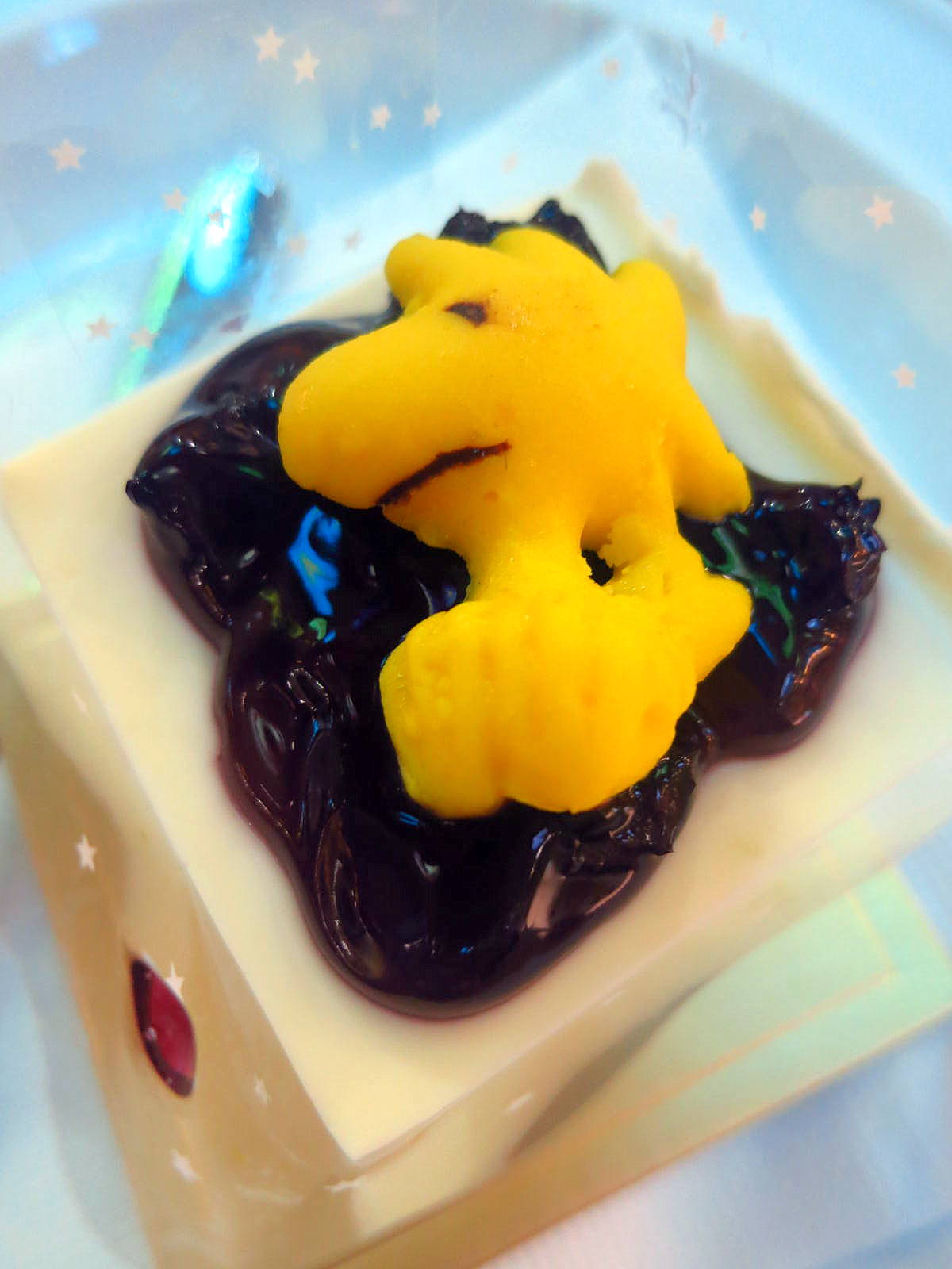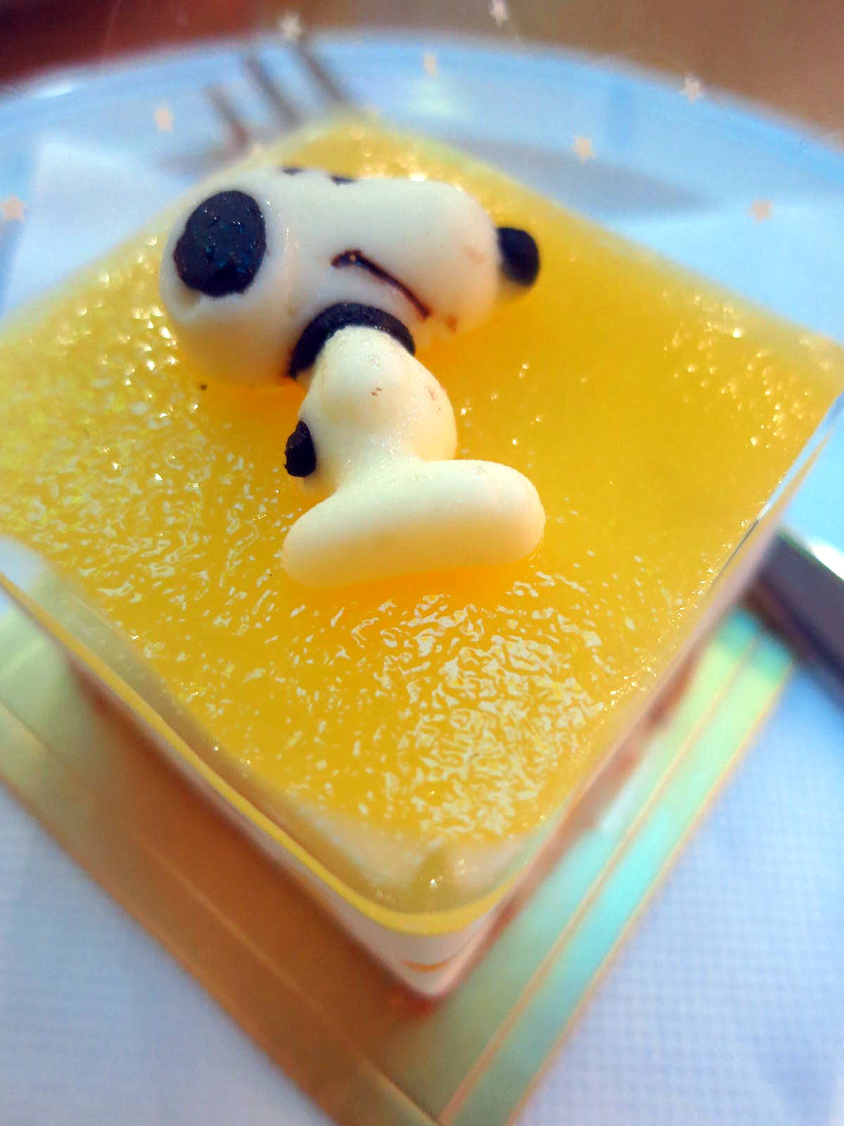Snoopy mango cheesecake. Notwithstanding their novelty value, the taste & texture of these cakes fall short of expectations. Blame it on a palpably gelatinous artifice.