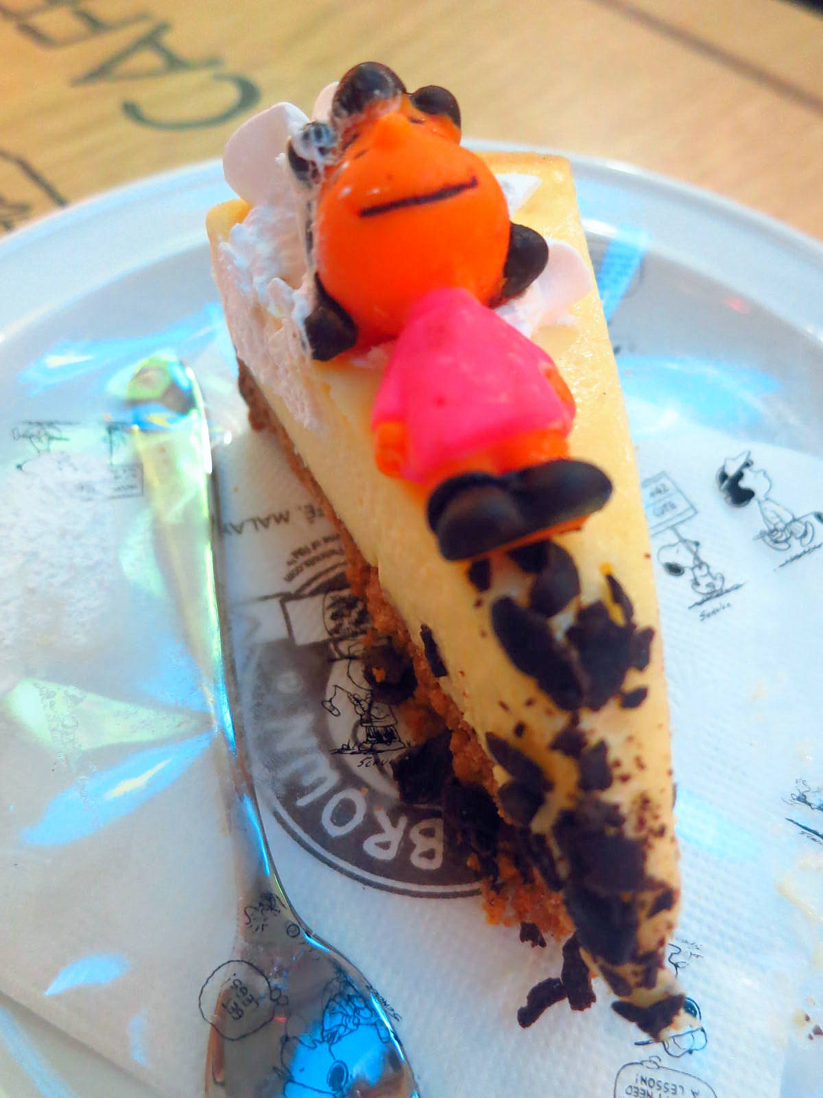 We stuck to sweets for this visit, ordering treats _ like this Lucy-adorned New York Cheesecake _ topped with chocolate miniatures & hand-made artwork of Charles Schulz's characters.