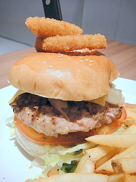 BOC Pork Burger, topped with bacon, onion rings & cheese. Excellently executed, though we wish CRH would go the whole hog & throw an egg into this too.