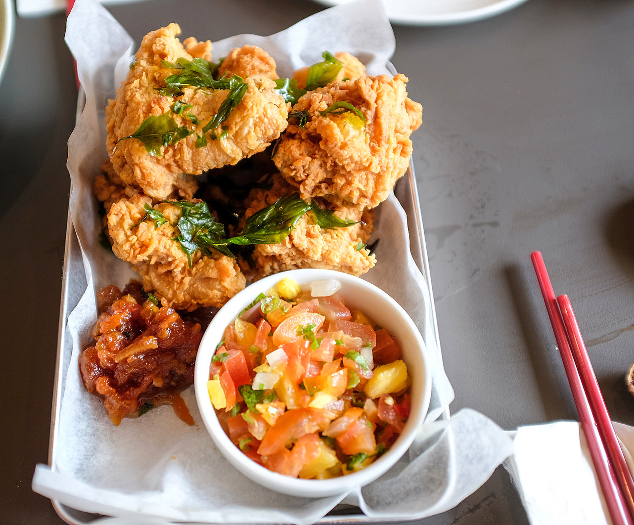 Can't stop snacking: Cincalok fried chicken, its savoury succulence, complete with the unmistakable flavour of fermented shrimp sauce, balanced by a fresh summer salsa of tomatoes & pineapples, plus thick, kitchen-made tomato chutney (RM25).
