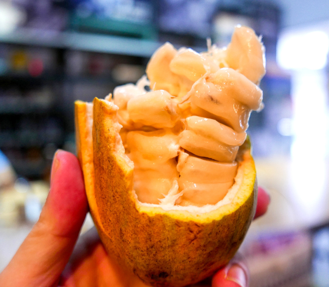 Each session, held at various venues once or twice a month, has a different focus, conducted by Chocolate Concierge founder Ning-Geng Ong. One recent gathering kicked off with an hour-long masterclass on chocolate production, spanning history, geography, science & sociology, with Ning bringing us freshly harvested ripe cocoa pods to illustrate how they're cracked, what their contents initially taste like (mangosteens - sort of!), & how they evolve through steps like fermentation, roasting & refining.