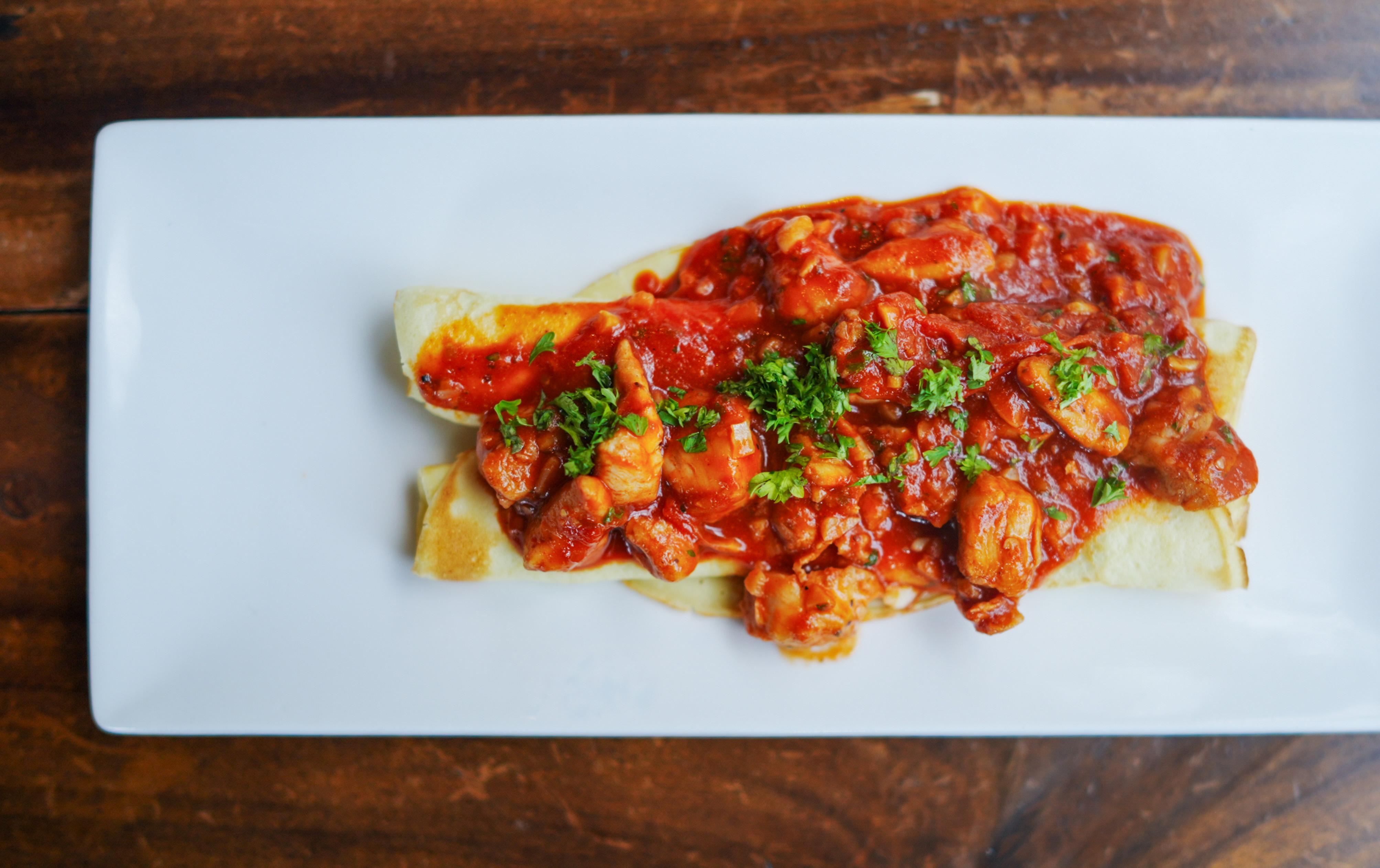 For the heartiest helping, have these smooth, thickly tender crêpes crowned with chicken fillets, cherry tomatoes and a garlicky-rich, kitchen-simmered pomodoro sauce, paired with rouge-hued elderflower soda sweetened with strawberries and apples. Très charmant.