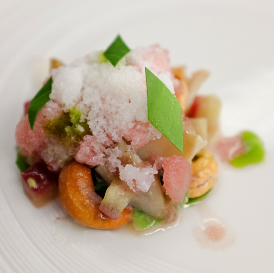 Now, the actual 10 courses after the prelude: First, a vivid ensemble of Pulau Ketam razor clams, sauteed & served chilled with cashew nuts, rose apples, 'tenggek burung' herbs & 'snow.' Teoh's creations are complex, & he likes guests to mix everything up before eating. A symphonic feat of flavour-juggling, ensuring the dynamics on the dish harmonise exuberantly.