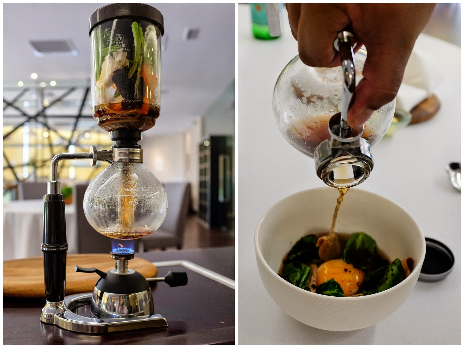 Not syphon-brewed coffee - Dewakan captures the headiness of a potent mushroom broth enhanced with mandarin peels, garlic & vegetables through this striking preparation, a pour-over for a congee of glutinous black Forbidden Rice with ox tongue & soft-boiled egg. Nearly every offering here qualifies as a 'signature dish,' but this is one of three that triumphantly stand out.