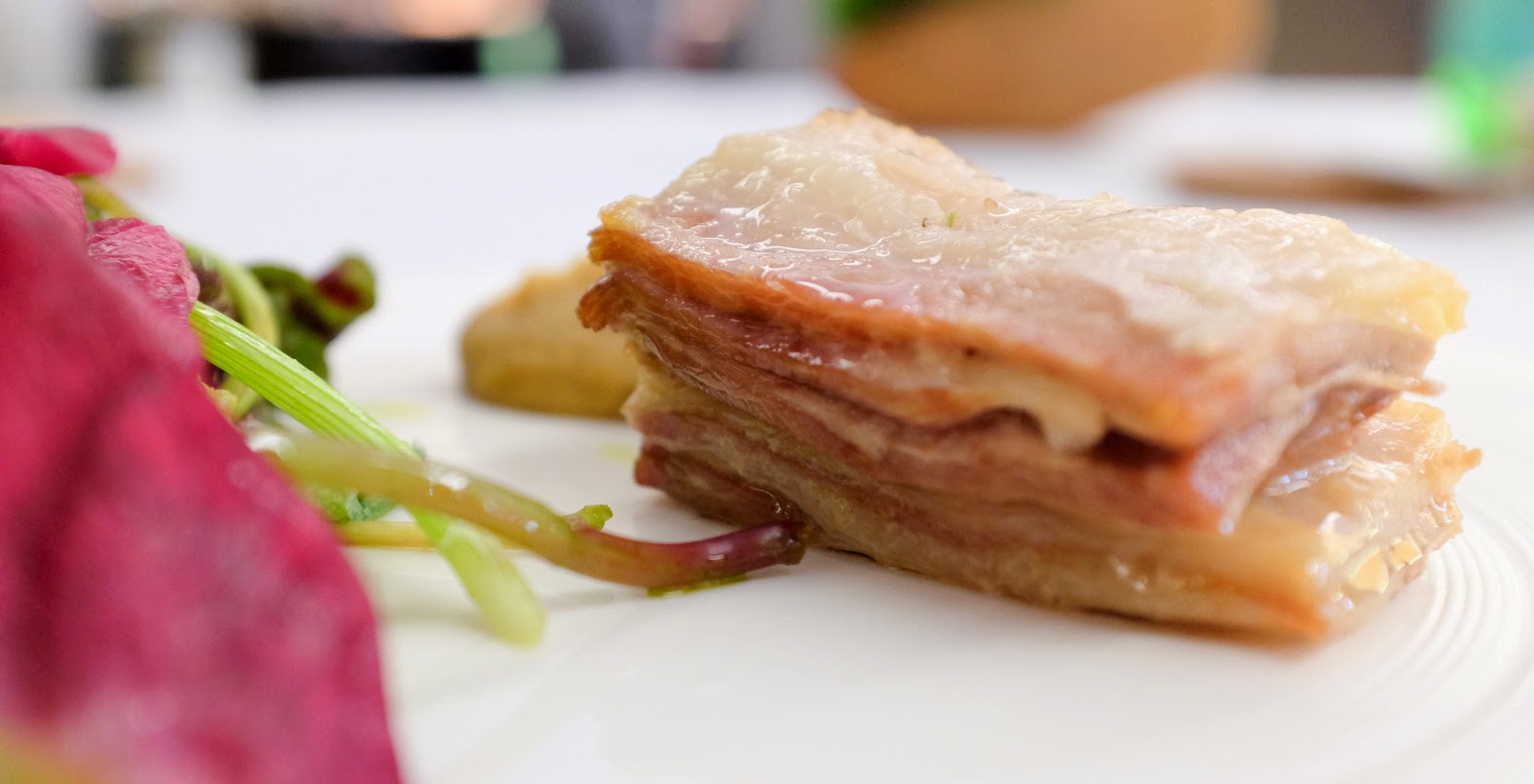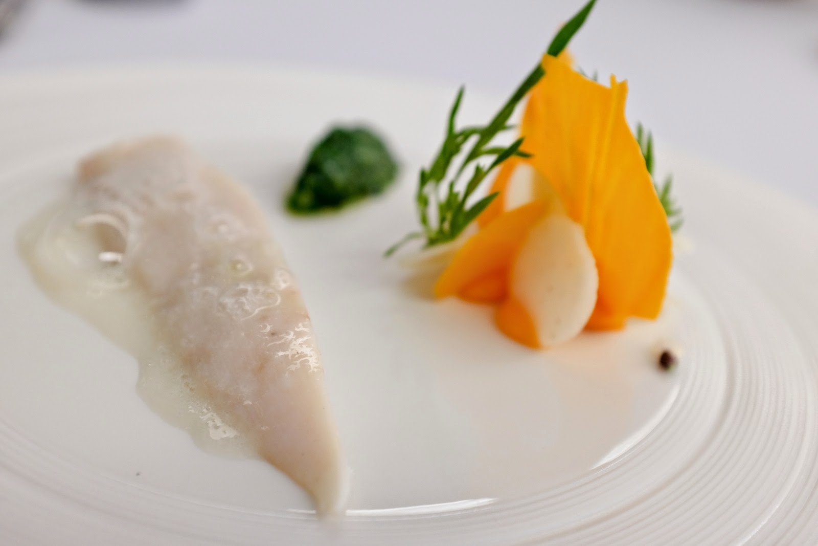 Guests won't find salmon or cod on Teoh's menu, which turns for now to pomfret, elegantly steamed over turmeric leaves; the understated, underrated fish constitutes a clean canvas for a complicated portrait of pleasure, painted with precision, with water chestnuts both whole & as a foam, salted egg yolk, paper-thin sweet potato crisps & puree of chrysanthemum garland. And no surprise, the Pulau Ketam prawns, razor clams & pomfret all come from champion supplier MySeafoodMart.