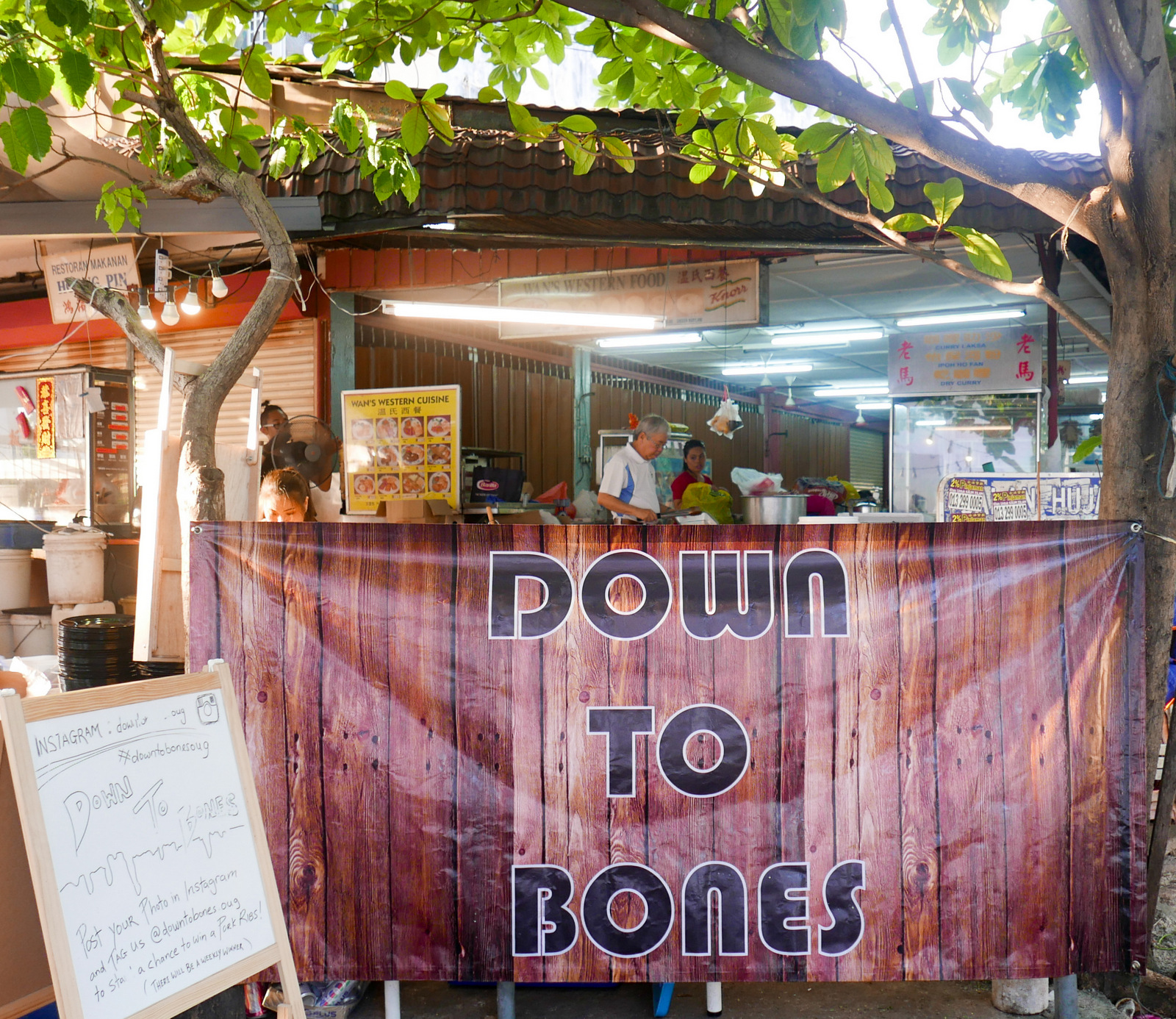 This weekend's dinner, conclusively settled: Down To Bones lives up to its caveman-baiting moniker, commandeering an OUG kopitiam every Saturday & Sunday evening, leaving hordes of us grunting with glee over a feast of pork ribs, chicken & lamb.
