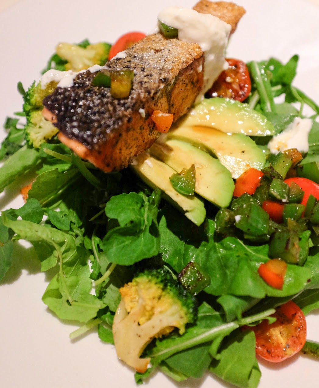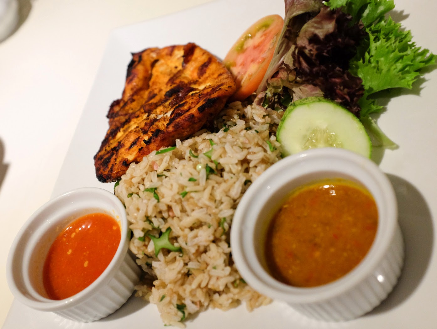 The menu manages to be both succinct & eclectic, spanning West & East, the former represented unsurprisingly by salmon, pan-fried with grape seed oil & served with a bountiful harvest of avocados, rocket leaves, tomato, capsicum, onions, lemon, parsley & Greek yoghurt, flavoured with liquid amino seasoning (RM30). Nutritional info is furnished: this totals 335 calories, comprising 30 grams of carbs, 23 of protein & 12.7 of fat. Meets the mark; capably executed.