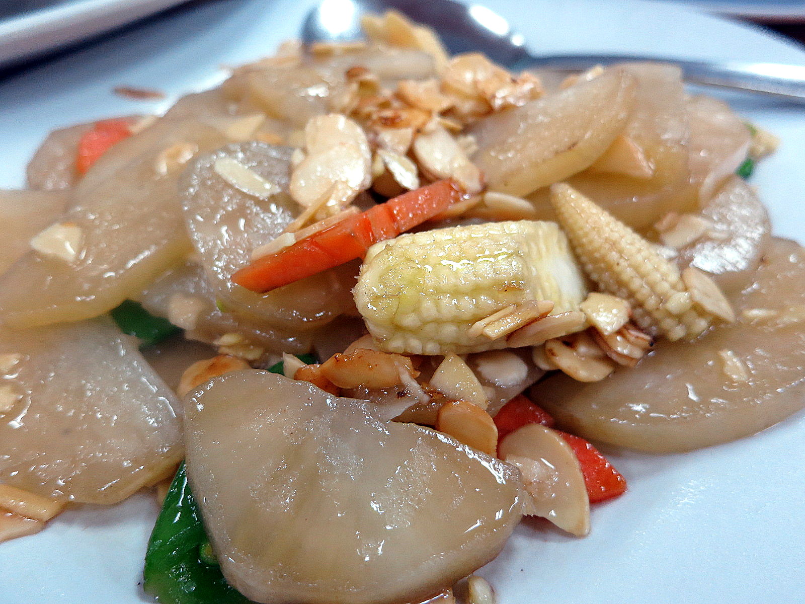 Stir-fried veggies with some crunchy, root-like fibers. Addictive, almost.