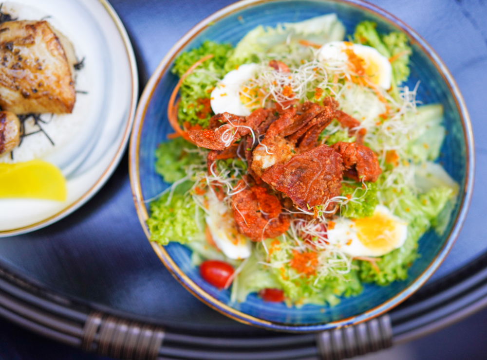 Start with the soft-shell crab salad, crowned with a crunchy, fresh crustacean, cushioned crisply by kyuri, julienne carrots, tobiko, green coral and cherry tomatoes, tossed in sprightly orange sesame vinaigrette (RM28).