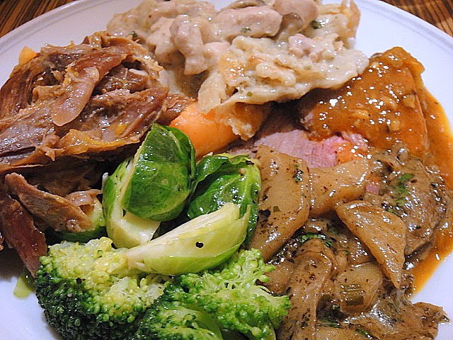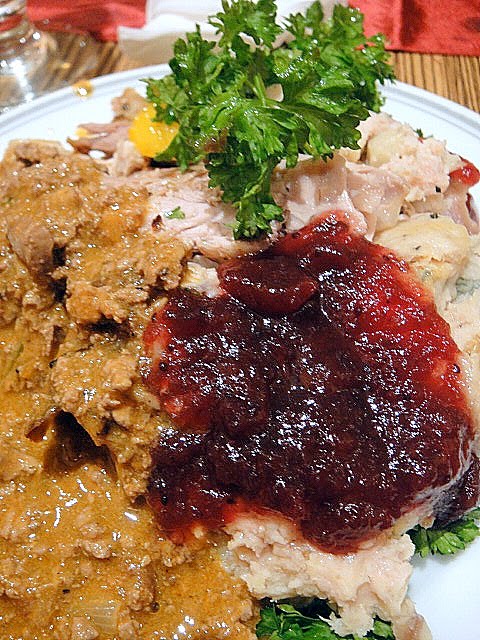 A plateful of turkey (dark meat, please), chestnut stuffing (delicious!), giblets & cranberry sauce to help me meet my turkey requirement for 2011.