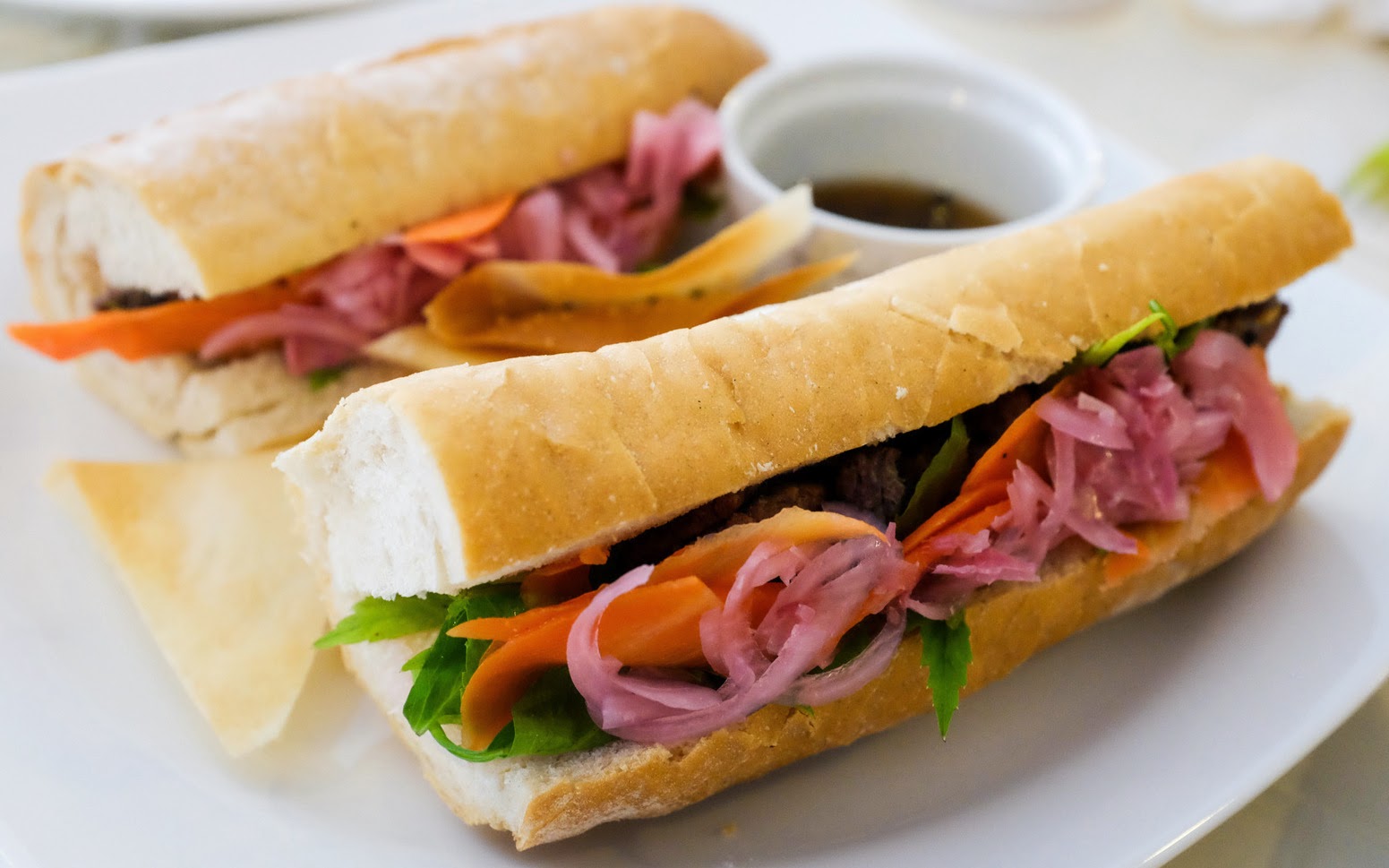 ... to this crunchy-fresh baguette, evocative of Vietnamese banh mi, stuffed with Cambodian-inspired lok-lak beef strips & Malaysian ulam-style leaves, accompanied by a piquant dipping sauce (RM21.90).