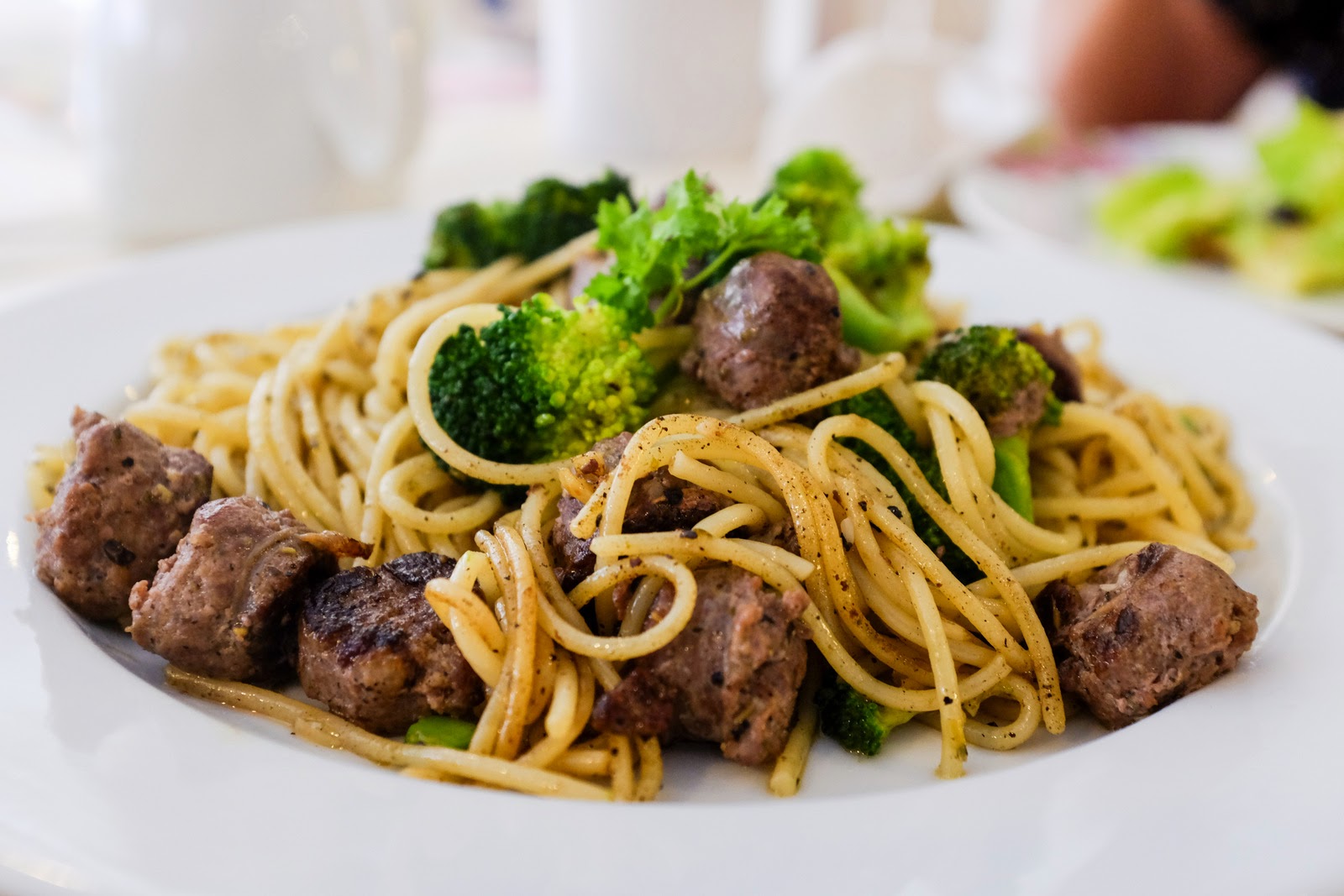 Main courses span the likes of spaghetti with meaty chunks of rustic beef sausage, baby green peas & broccoli (RM27.90) ...