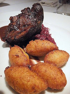 Wagyu beef cheeks with braised red cabbage, mole sauce & pumpkin dauphines. Sumptuously succulent, reminding us how sublime beef can be in the right hands.