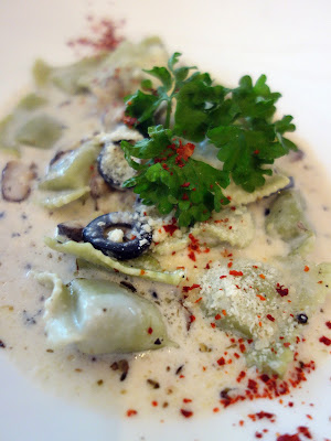 Spinach ravioli with ricotta (the menu calls the cheese homemade, but were less certain), drowned close to death in a cream sauce of garlic, mushrooms & olives. The too-stodgy ravioli reminds us why mass-manufactured pasta is never as prized as restaurant-produced renditions.