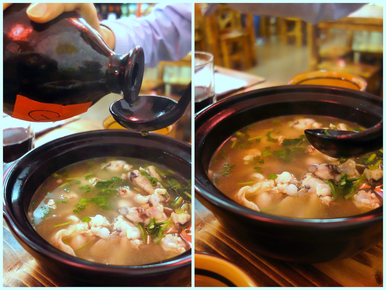 Here's where the wine comes into play: This friendly, efficiently operated eatery offers three-year-aged & five-year-aged bottles for customers to splash a spoonful of wine into their soup _ it's a wonderful way to boost the flavour & fragrance of these meals.