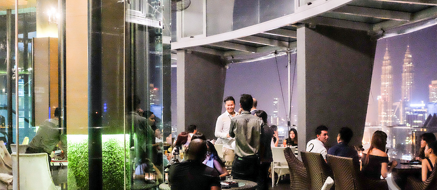 On a breezy night, Hemisphere's glittering 37th-floor alfresco drinking area comes alive with customers sipping basic cocktails (Pina Coladas & Tequila Sunrises) & savouring the view of KL's skyline, with the Twin Towers looming a few kilometres away.