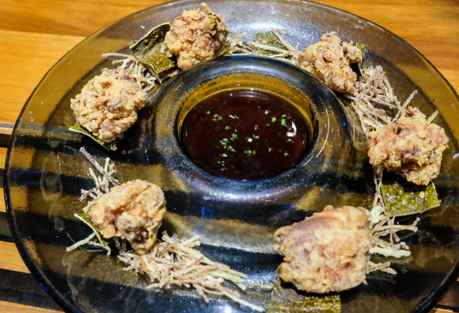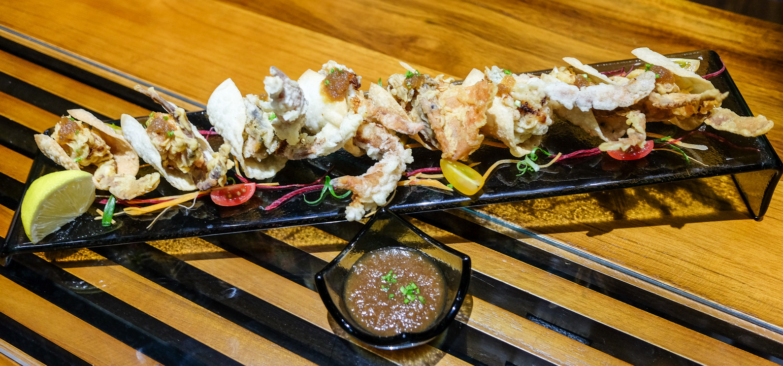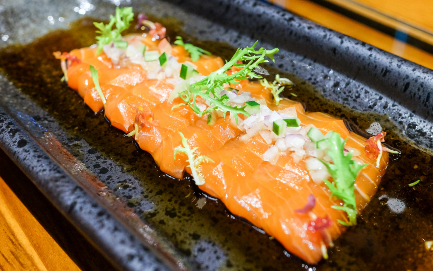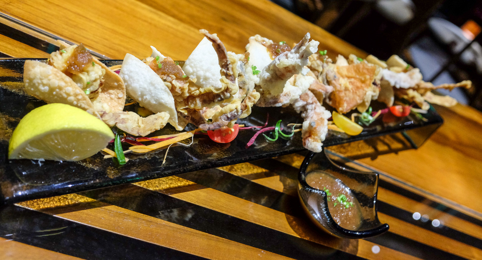 Fried fare is designed to be crowd-satiating: The crispy calamari with chillies (RM12) proves addictively irresistible, & the chicken karaage (RM20) is unexpectedly cushioned with salmon skin for merry munching, while the soft-shell crab (RM38) is made extra memorable in a distinctive preparation that wraps each slice in crispy dumpling shells for double the crunch.