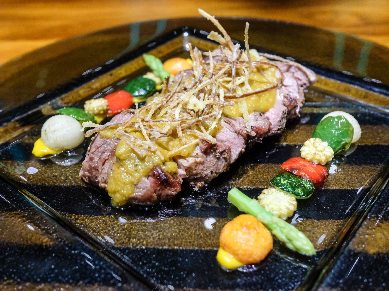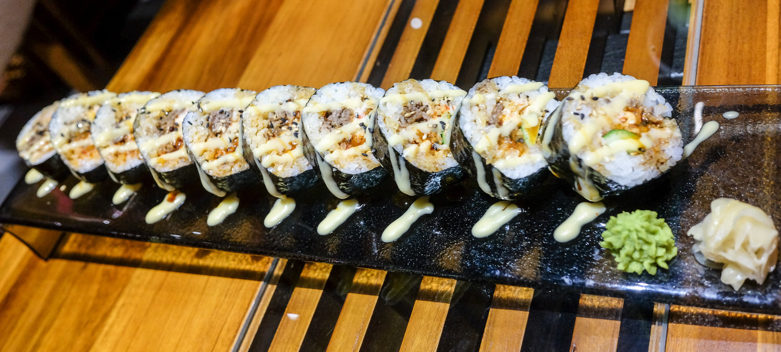 Australian beef is a star ingredient throughout these offerings; the Korean influence is unmistakable in the hearty bulgogi sushi roll laced with sauteed kimchi (RM18) & tasty beef bibimbap (RM27). Other bovine-based mains include ramen in a light & mild miso beef broth (RM30) & Black Angus steak with a savoury sauce that evokes Japan's simmered tendon stews (RM150).