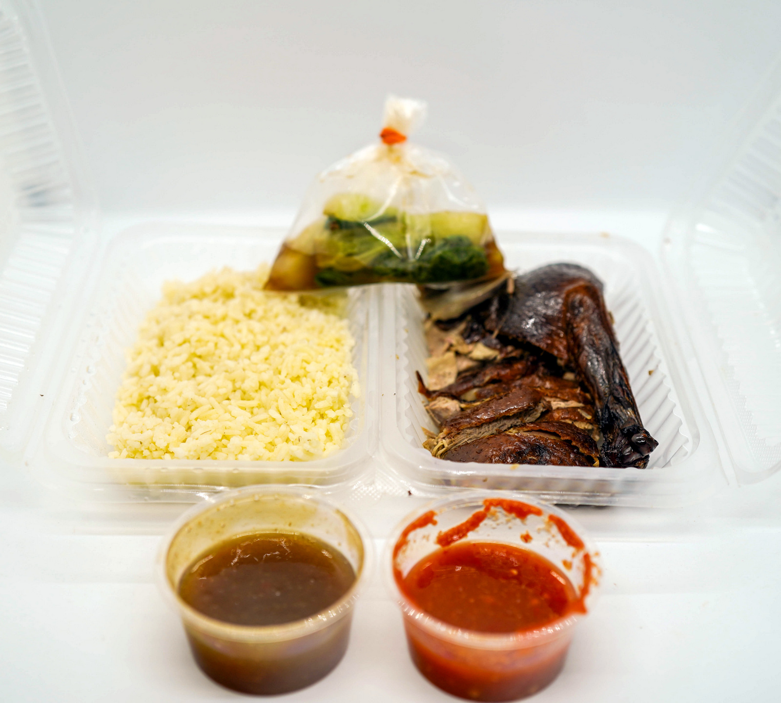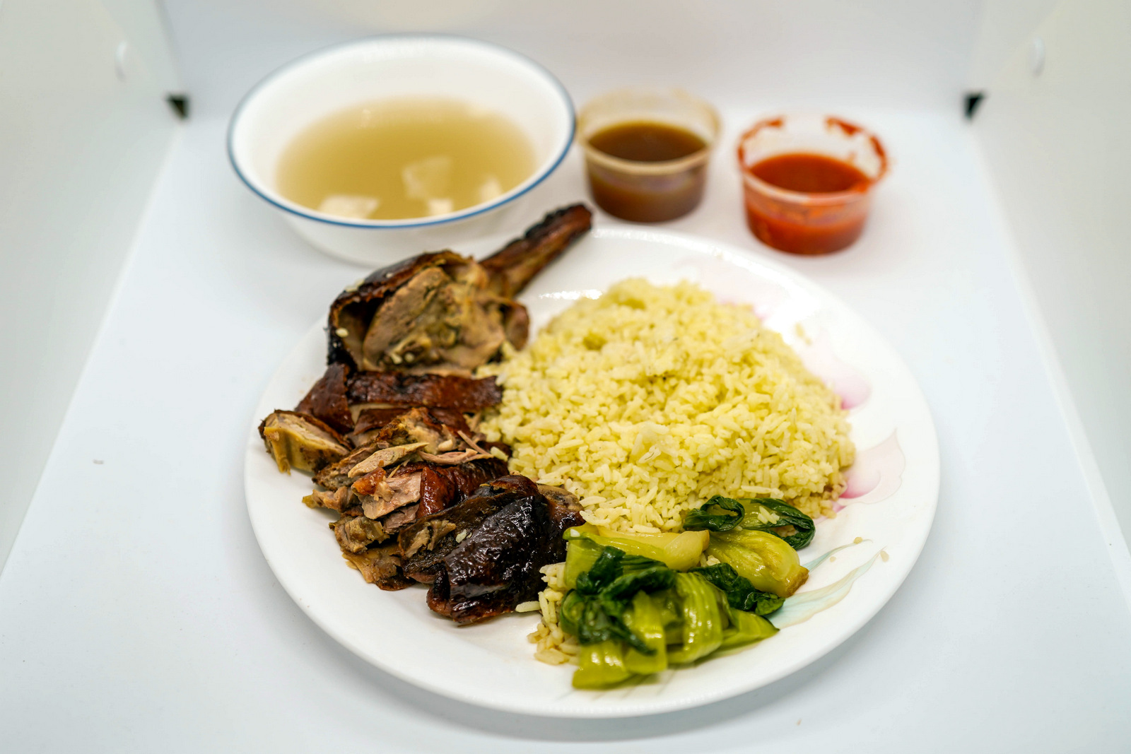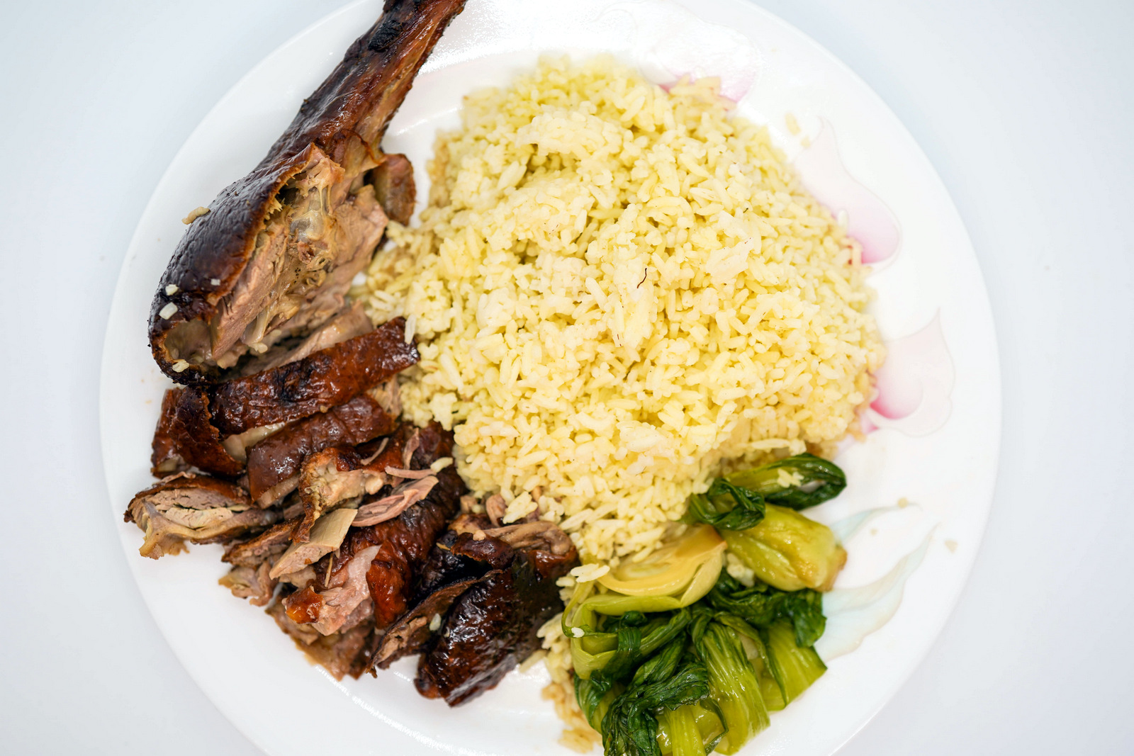 Its inherent gaminess is sweetened with a side of plum sauce, rounded out not only with buttery rice but bok choy, cabbage soup and chilli onion gravy.
