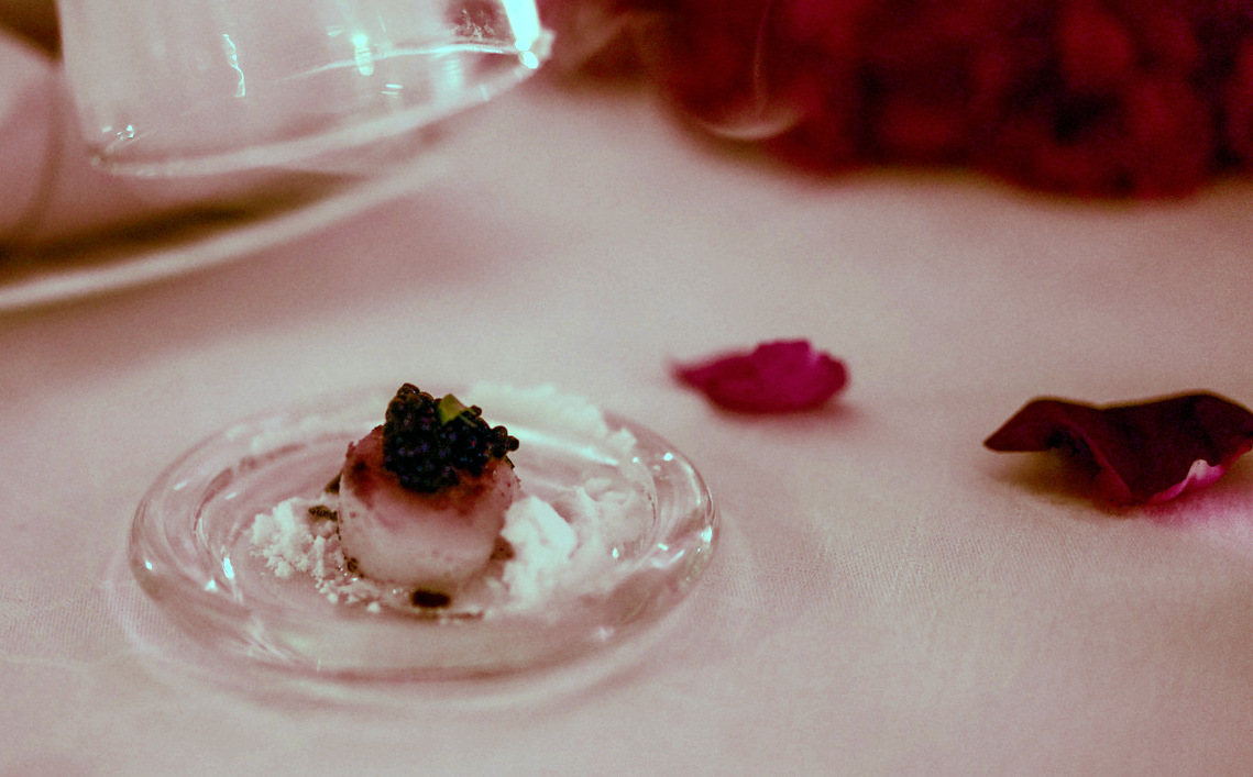 A swirl of smoke dramatically announces the arrival of the opening salvo, dubbed 'Almost Raw' - a very lightly pan-seared scallop, its plumpness crowned with a generous shower of Osetra caviar, their brininess blending harmoniously with the earthiness of crispy duck chips, carrot, cress and cumin sand.