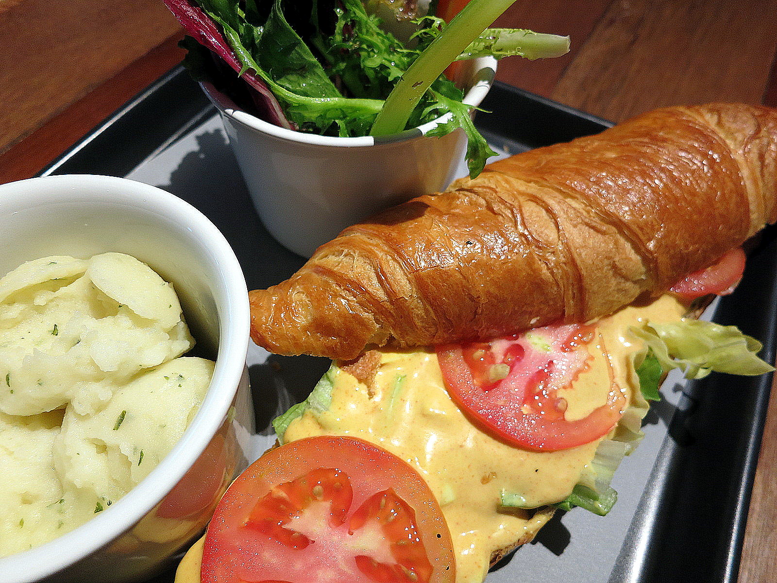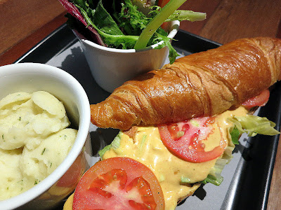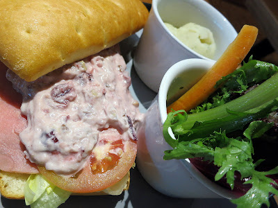 Turkey breast, cranberry sauce, mayo, chopped walnuts & Swiss cheese, crammed into ciabatta, coupled with mouthwatering mashed potatoes & a light, crisply fresh salad. Meals seldom seem more balanced than this.