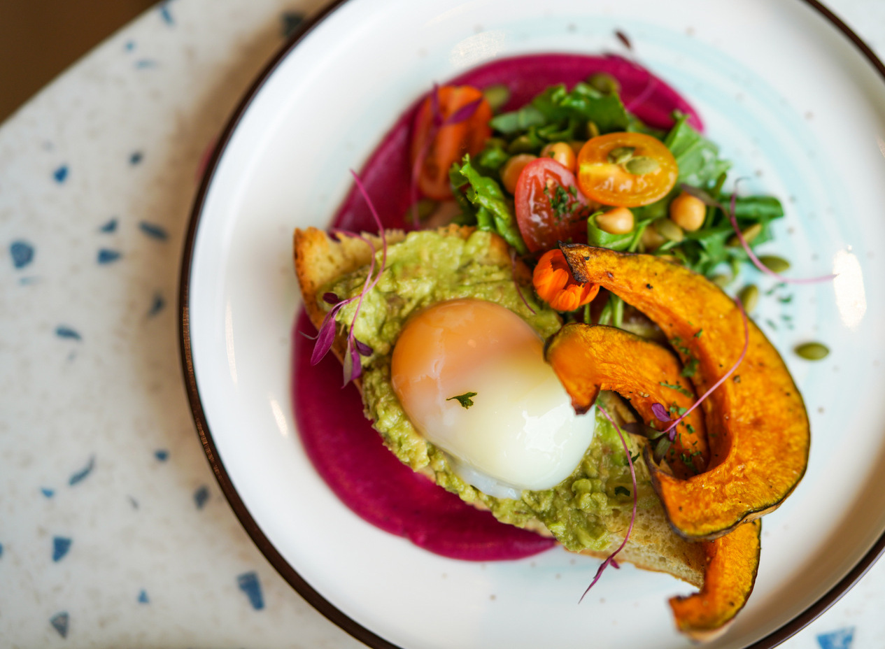 Brunch lovers will like the Avo & Labu, a smashed avocado toast with roasted pumpkin and poached egg that’s nearly outshone by the coupling of a zesty chickpea salad with beetroot hummus (RM28).