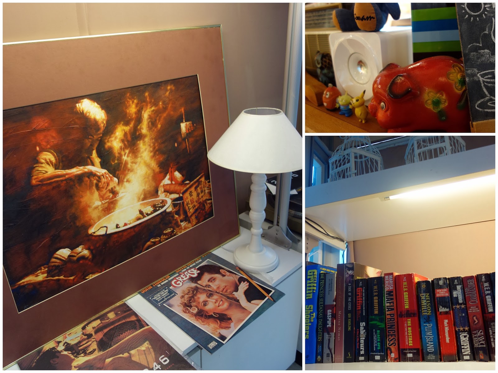 ... plus put-away-those-iPads shelves of novels & record covers from when Travolta & Newton-John were pop culture titans.