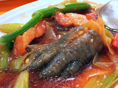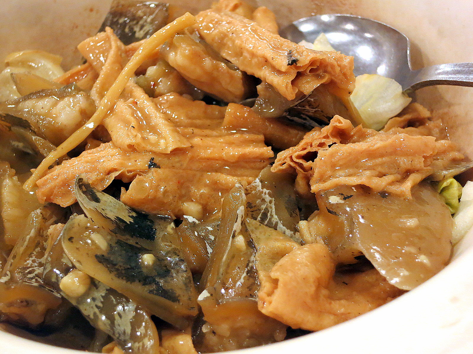 Crocodile skin with bean curd strips. Chewy, with a fishy flavor that might repel some customers.