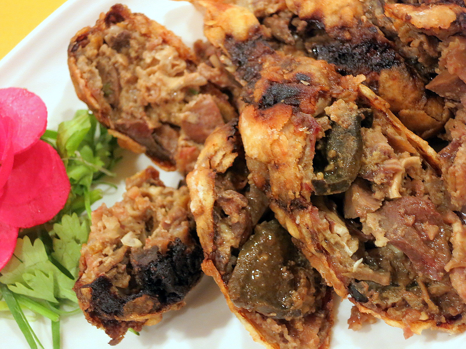 Crocodile offal roll, fried with everything from the heart & liver to who-knows-what-else. Like a cross between Penang lor bak & Chinese New Year preserved sausages.