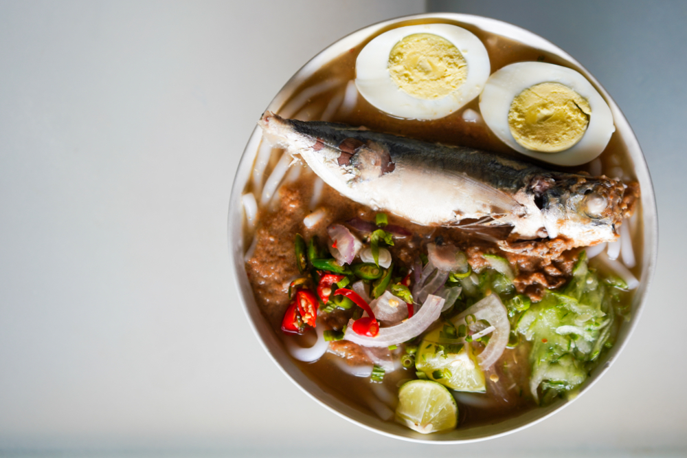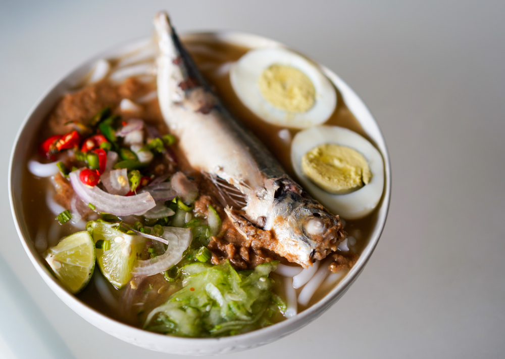 The Laksa Perlis features rice noodles with briny broth that speaks of the sea, with lime for tang and chillies for plenty of heat - have it topped with ikan sekoq, a whole fleshy fish, for potently flavourful effect. The laksa starts at RM7; a larger version with extra ulam and hard-boiled egg is RM9; the full works with the fish is RM12.
