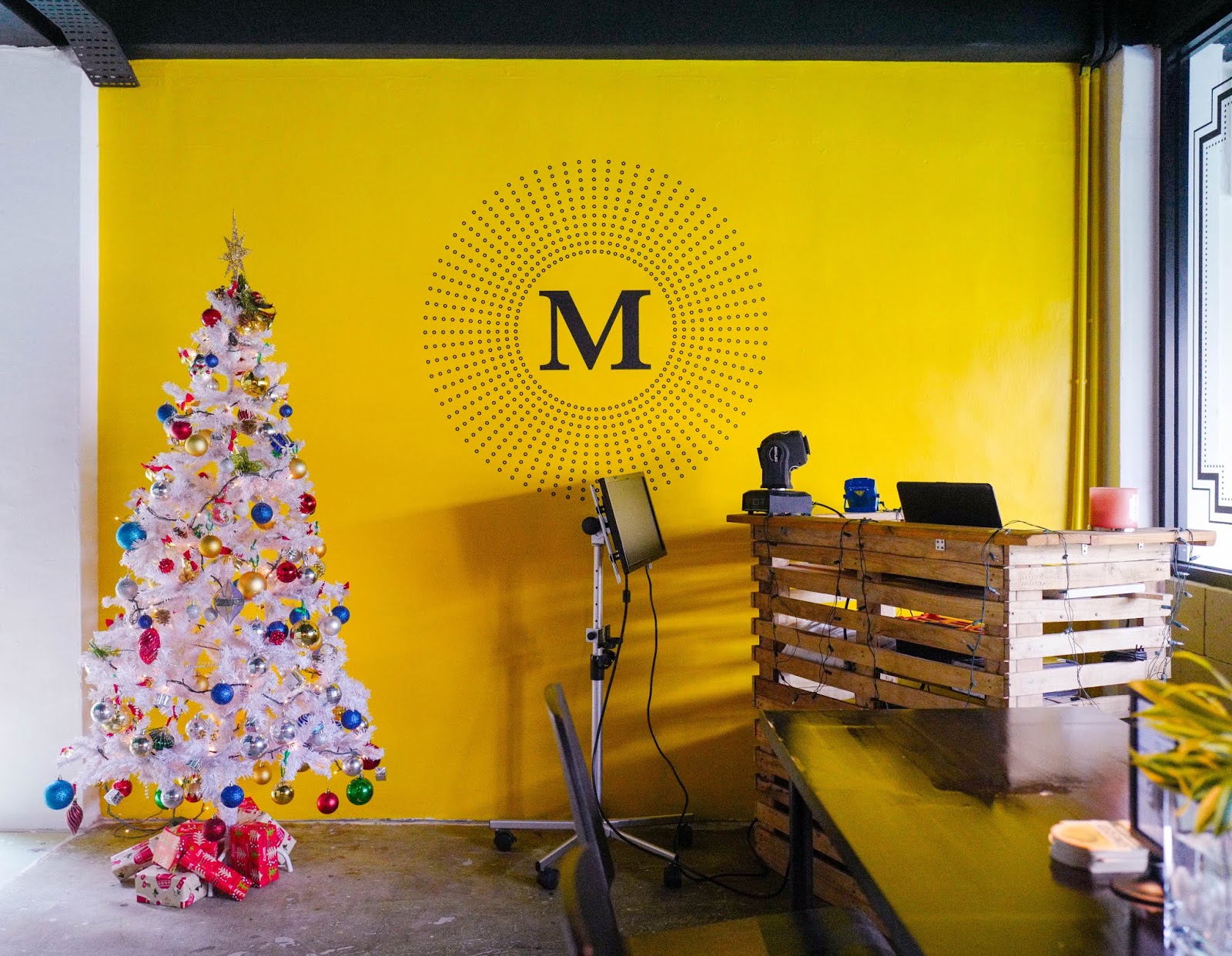 M Cafe is located on the first floor of its row. Look for the yellow door beside Raj's and head upstairs.