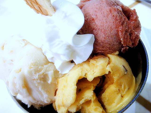 Flavors include pumpkin, fig, persimmon and pomegranate, all supposedly natural, formed with real fruits and plants. Might be an acquired taste, far less saccharine than most ice cream, with a fascinatingly chewy-sticky texture that's worth trying at least once.