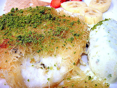 Kunefe, a hearty traditional dessert wrapped in kataifi pastry, topped with crushed pistachio, filled with mozzarella-like halloumi cheese and served with pistachio ice cream.