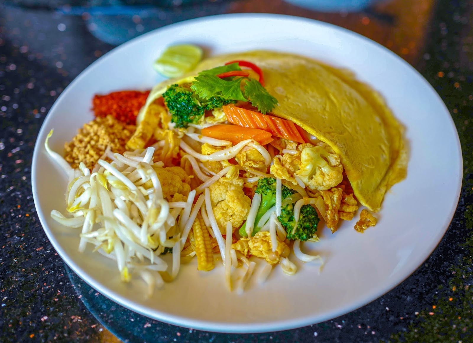 Other vegetarian specialities include the Deep-Fried Spring Rolls, the ideal starter for sharing, crisp to the bite and juicy to the chew, followed by single-plate main meals like the Vegetarian Phad Thai, comfortingly blanketed in a warm omelette, eschewing pork or prawns for a medley of carrots, cauliflower, corn and broccoli, and the Vegetarian Fried Kuey Teow, perhaps the most wholesome fried kuey teow preparation possible at a Thai restaurant, but every bit as slick and flavoursome as we'd want it to be.