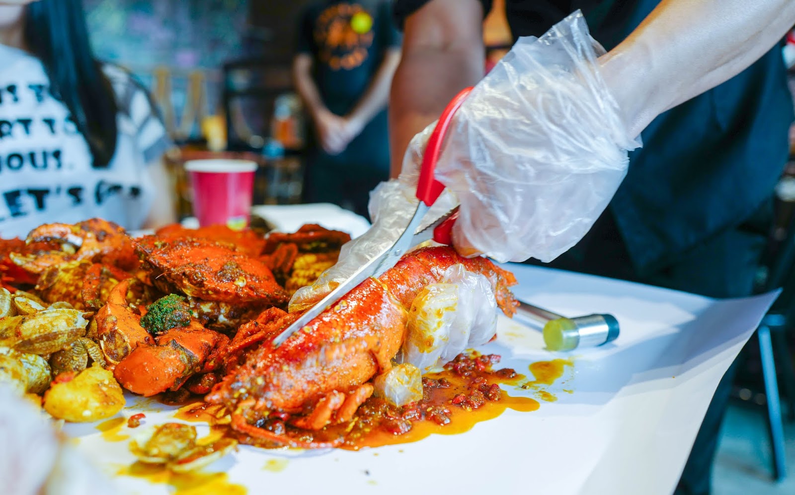 Everyone should don the bib and gloves provided by Shell Out's friendly crew before the seafood surfaces, splashed out over the white sheet of paper placed on each table. Each bag of seafood is brought out steaming-hot from the kitchen, unloaded in front of you with its bounty of fresh catch in your choice of sauce.