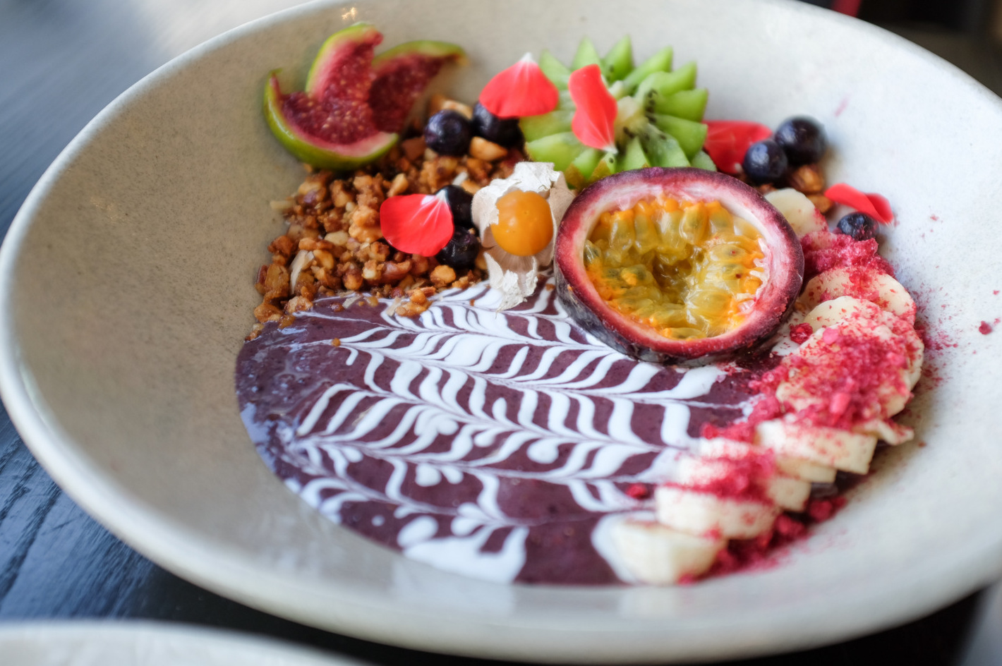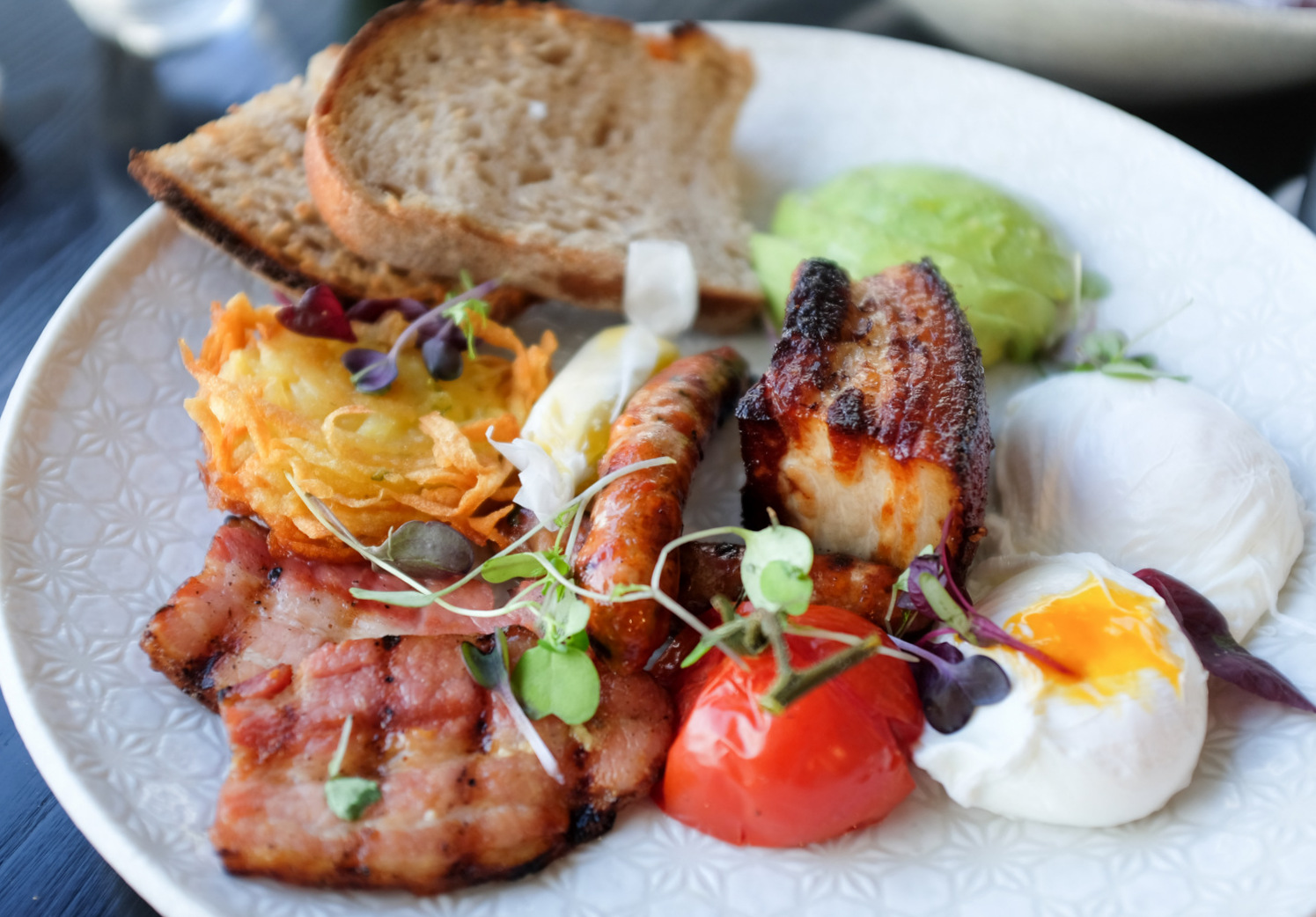 Breakfast of contrasts: A devil-may-care Big Fill platter of thick-cut bacon, succulent pork belly, poached eggs, lamb sausage, agria potato rosti, avocado, sourdough toast & butter, alongside a more conscientious Acai Bowl that's thick with seasonal fruits & house-toasted nut crunch - both choices prove equally excellent, washed down with a Sprouting Green smoothie made of kale, spirulina, mango & pineapple juice. Major Sprout is majorly delicious.