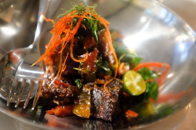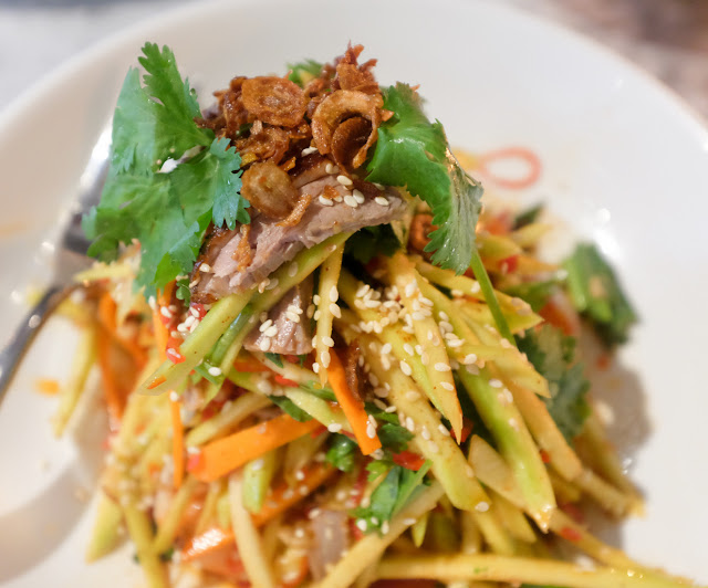 Mama San's starters take a fowl turn - Indonesia's 'Ayam Tangkap Aceh' with curry leaves, pandan & & green chillies (RM28) channels a tongue-tingling spiciness, but the Vietnamese-inflected duck salad with green mangoes, carrots, shrimp, coriander & 'nuoc cham' sauce (RM30) rules the roost with its tangy-sweet dynamics.