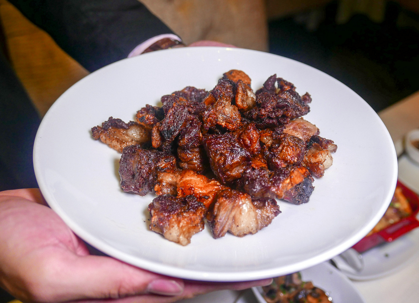 Each steak is typically served a choice of side dish & sauce; there are 12 possibilities among the former, with highlights like Alsace-style French fries topped with crispy beef, gruyere cheese & onions; lovely lovely tempura fries or onion rings; creamy spinach; green asparagus with butter; or wild mushroom ragout with garlic & parsley, plus 10 of the latter, including bearnaise, calamansi butter, tamarind-coriander butter, fresh horseradish cream, green peppercorn, red wine or lemon gremolata. For our Tomahawk, an additional surprise was a side plate of fried beef trimmings from the gigantic cut, a robust & smoky indulgence.