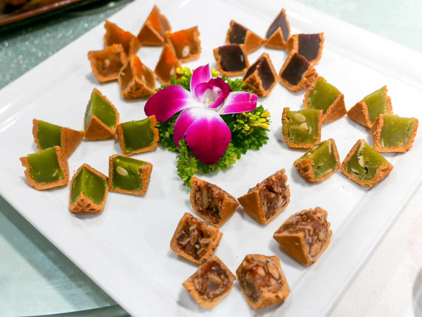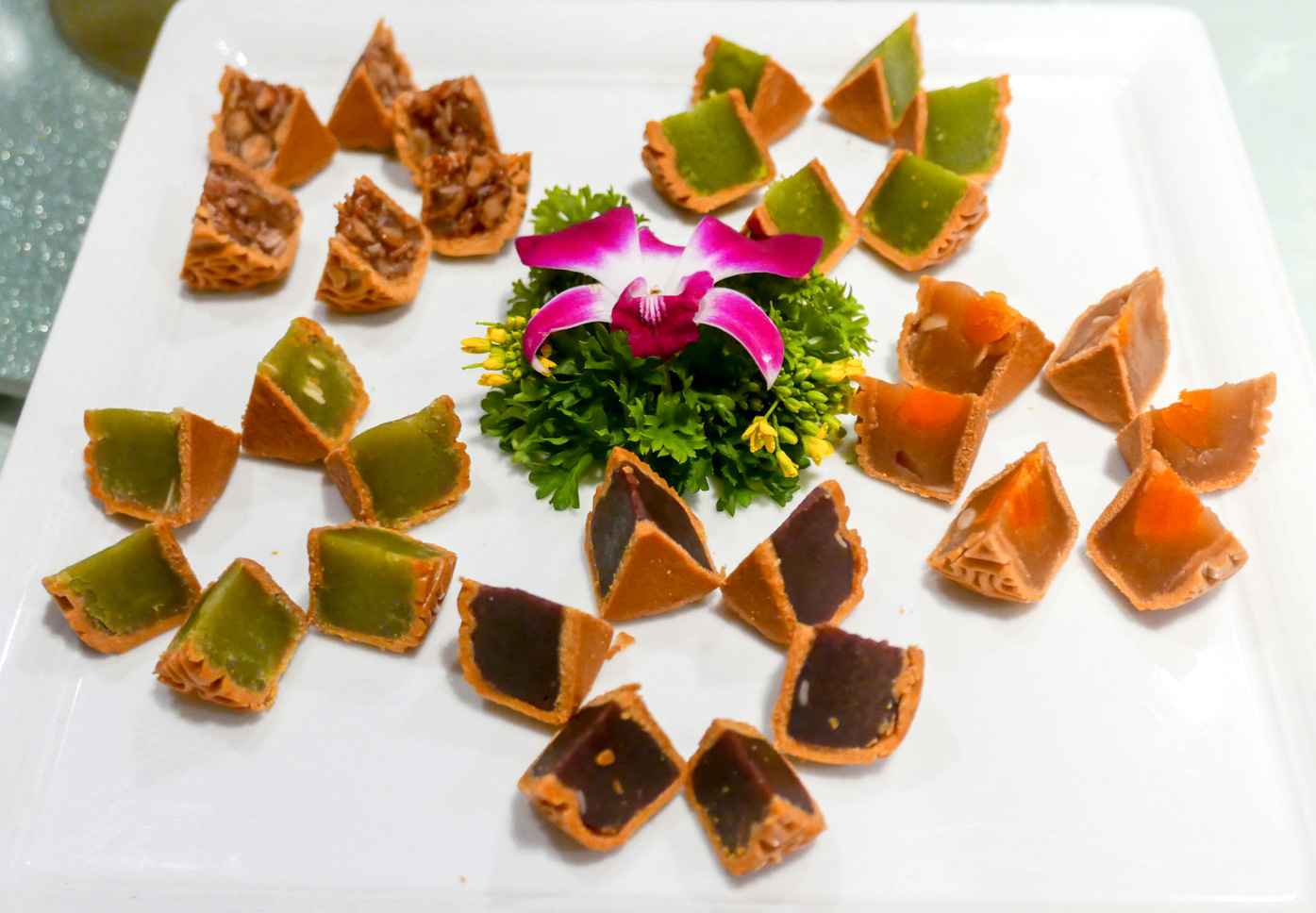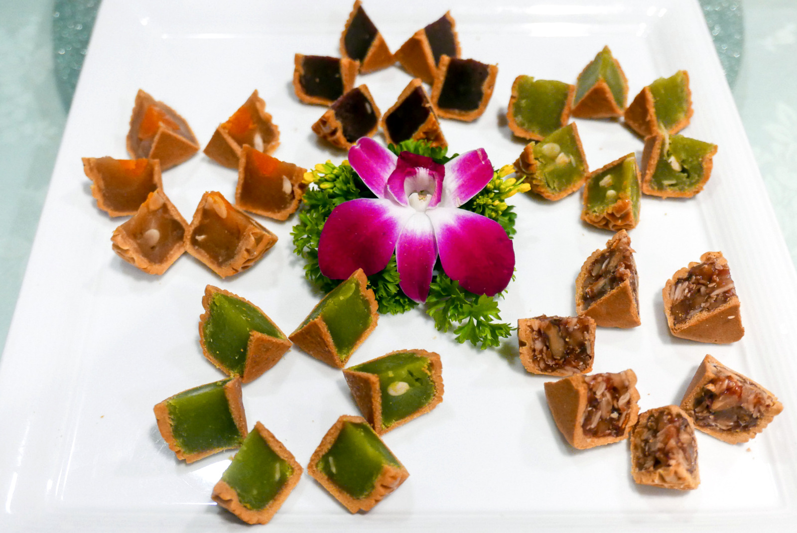 Each box's outer loveliness is rivalled by that of its oven-baked contents: Set A consists of Japanese red bean, pure lotus single yolk, golden pandan pure lotus, white pure lotus, assorted fruits & nuts & green tea pure lotus paste, while Set B features golden pandan pure lotus single yolk, white pure lotus paste single yolk, green tea pure lotus paste, Japanese red bean, pure lotus & golden pandan pure lotus, each satisfactory in taste & texture. For customers who enjoy snow-skin varieties, the Musang King Durian is worth checking out too - fragrant & flavoursome, freshly made daily (seasonal price).
