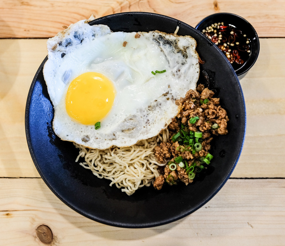 The strength of the zhao chai hung ngang (RM12.90) rests in the sour-spicy punch of its clear broth, infused with preserved mustard greens & chillies, bolstered by a mix of pork & fish balls, tomatoes & siew pak choy. It's also the base that sets Curry Kari Noodles apart (RM12.90) - chicken curry that Alicia has tweaked to straddle the line between rich & light, served with a choice of ramen or thick rice vermicelli, topped with shredded chicken, a prawn, half a boiled egg, beansprouts & long beans.