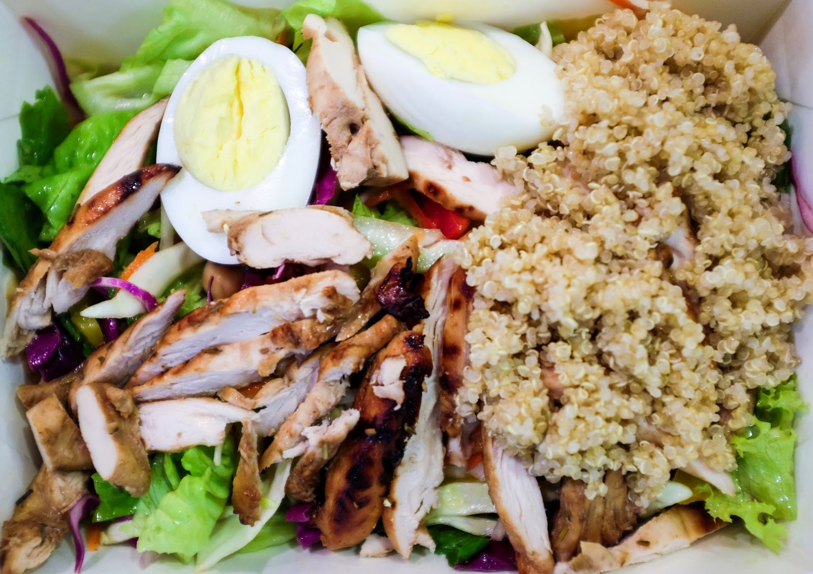 Love Easy Green's signature salad, encouragingly crisp & fresh, with well-balanced flavours & textures, topped with juicy grilled chicken & egg, garnished with cheese, nuts & apple cider vinaigrette (RM15; add RM3 for a hearty scoop of quinoa).