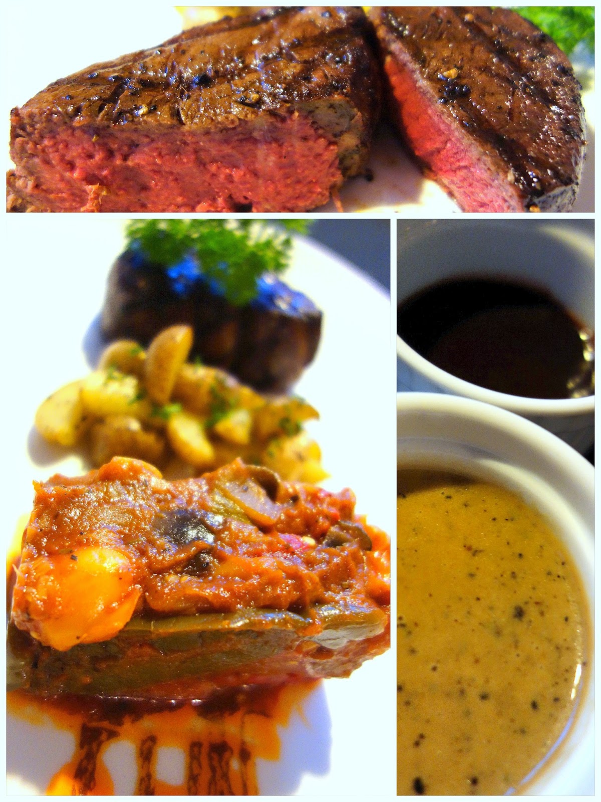 Tender, meaty beef, well-prepared & well-partnered with luscious ratatouille & creamy black pepper & red wine sauces.