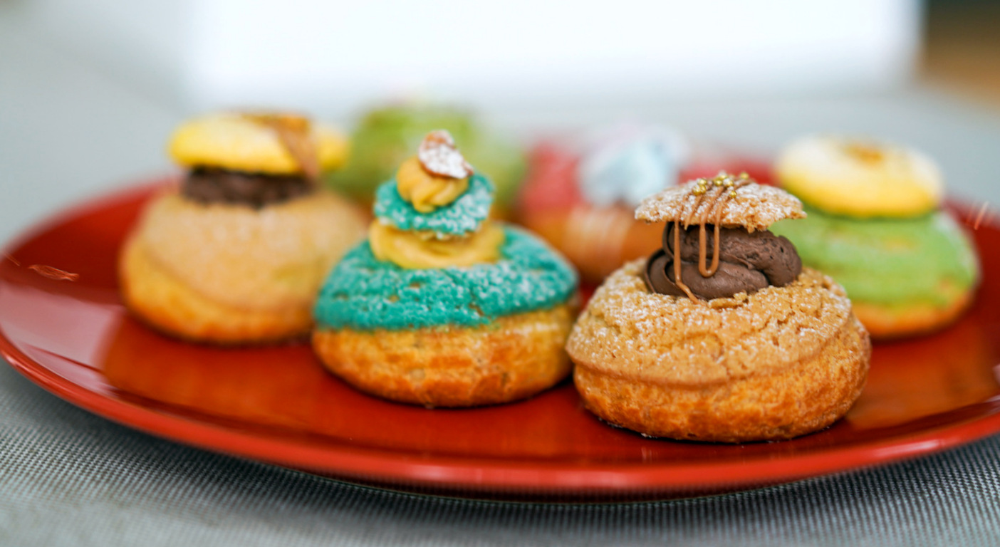 These tempting treats take pastry pleasure to lovely new levels, layered on top with craquelin (a crisp cookie-like overlay made with brown sugar, butter and flour), concealing a lightly luscious core of flavoured creme chantilly in choux pastry.