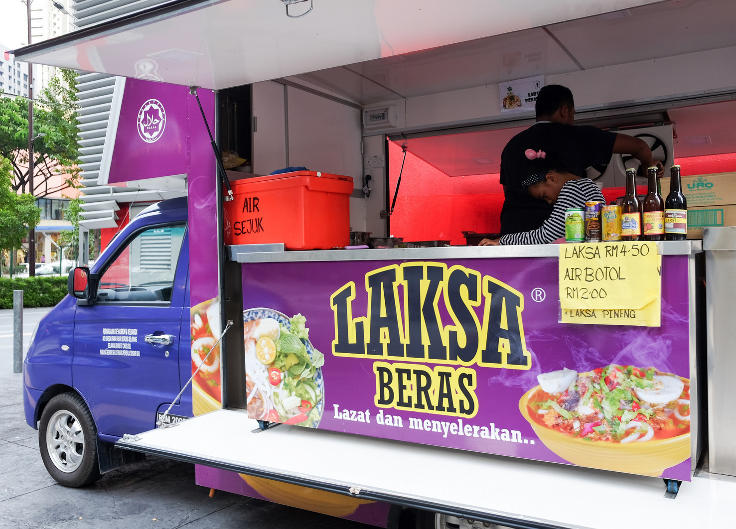 Scratch that itch for a lightly tangy, aromatic assam laksa, served fresh & hot for only RM4.50, at the Laksa Beras food truck, parked beside Menara Binjai, a short stroll from the Ampang Park LRT station, operating most weekdays, 4pm through 8pm.