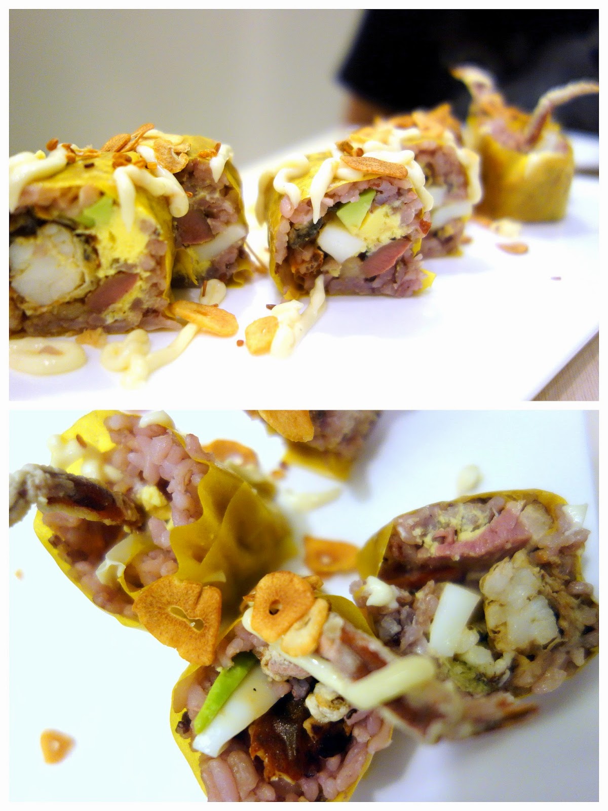 Hokkaido crab meat, seasoned scallops & tamago omelette with white sesame & kiwi mayo on the side (RM18.90++ - a RM13.90++ small with one 'premium' ingredient for a RM5++ surcharge ). We'd probably recommend the 'large' portions, since those seem to be more fully stuffed; customers can also pay an extra RM1++ to have each roll coated in tempura batter.