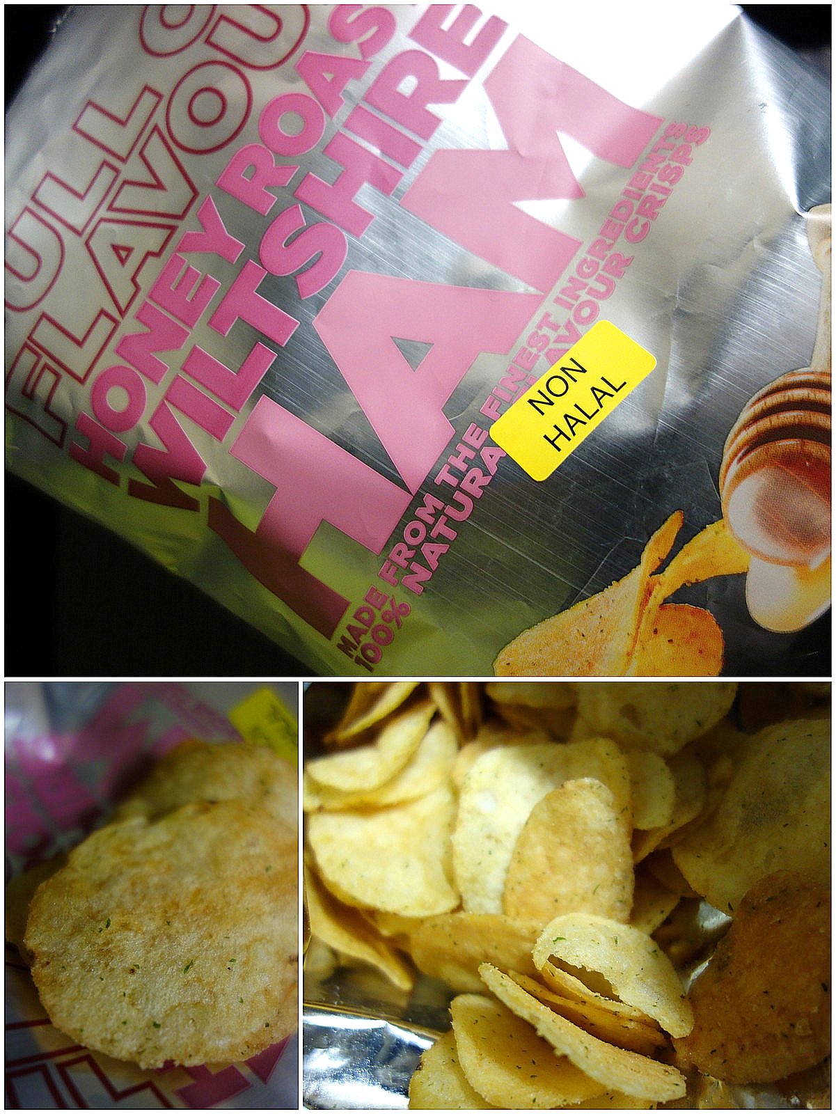 The Bakery is inside Marks & Spencers food hall, where other pleasant surprises await: this intriguing bag of crisps is emblazoned with the words "Honey Roast Wiltshire Ham" & a non-halal sticker. The ingredients list shows no pork, but the crisps do have something of a hammy taste.