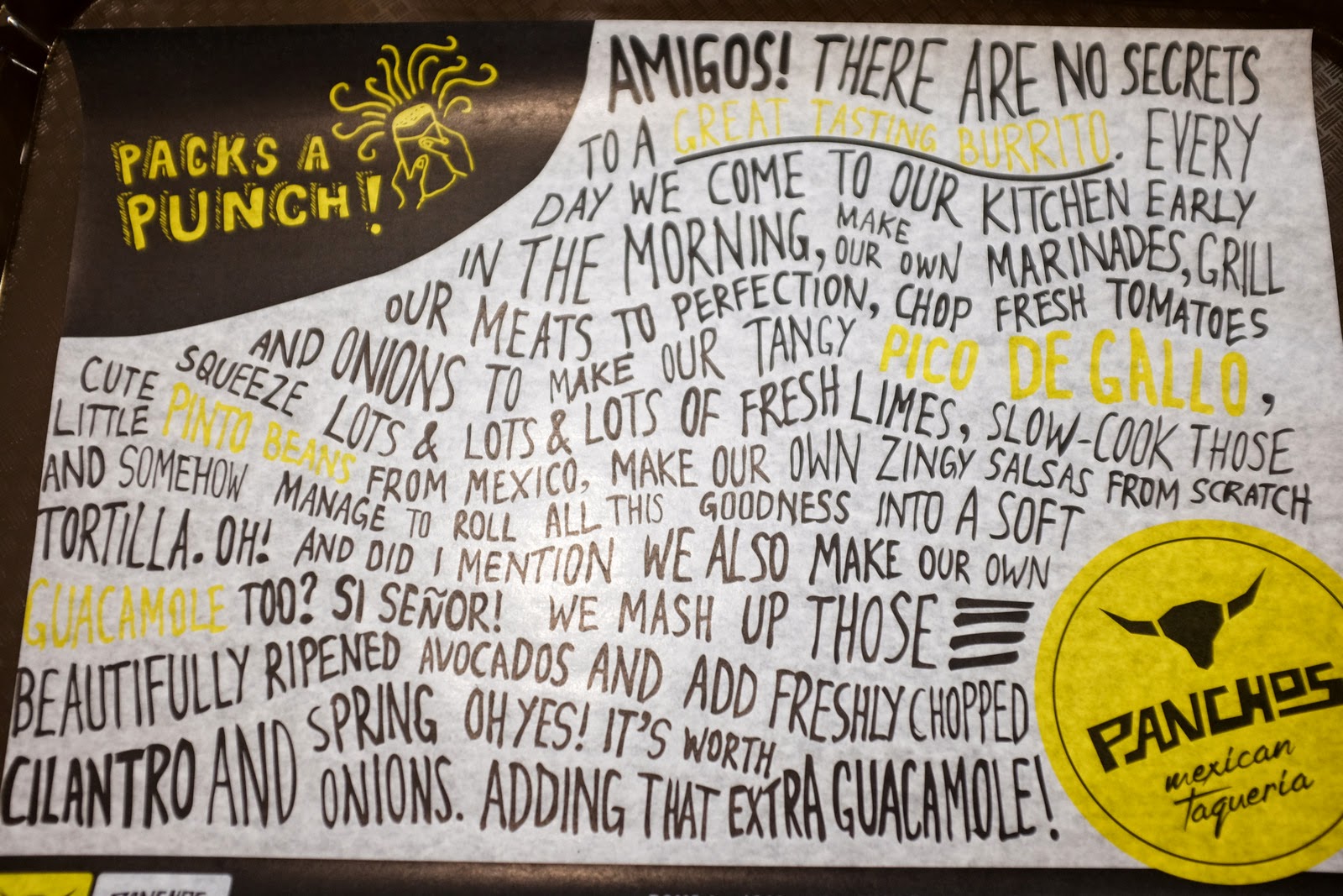 Panchos does justice to the fundamentals of a taco shop - customers can choose from soft flour tortillas or crispy shell corn versions, filled with one of the following five - smoky chipotle slow-roasted pulled beef, slow-braised sweet-sticky beef brisket, flame-grilled herb chicken, picante chilli chicken or pan-fried fish - plus pico de gallo, lettuce, sour cream, cheese & lime. Convincingly textured, with an unmistakable vitality in taste that's a testament to Panchos' kitchen-produced marinades & fillings, which reputedly include pinto beans from Mexico, made-from-scratch salsa & market-fresh tomatoes, cilantro & onions.