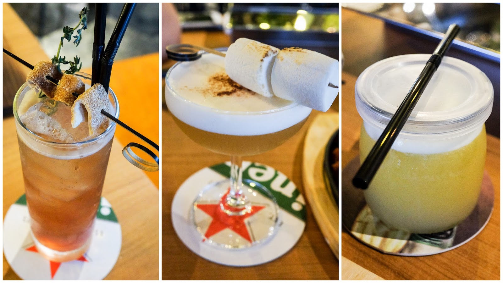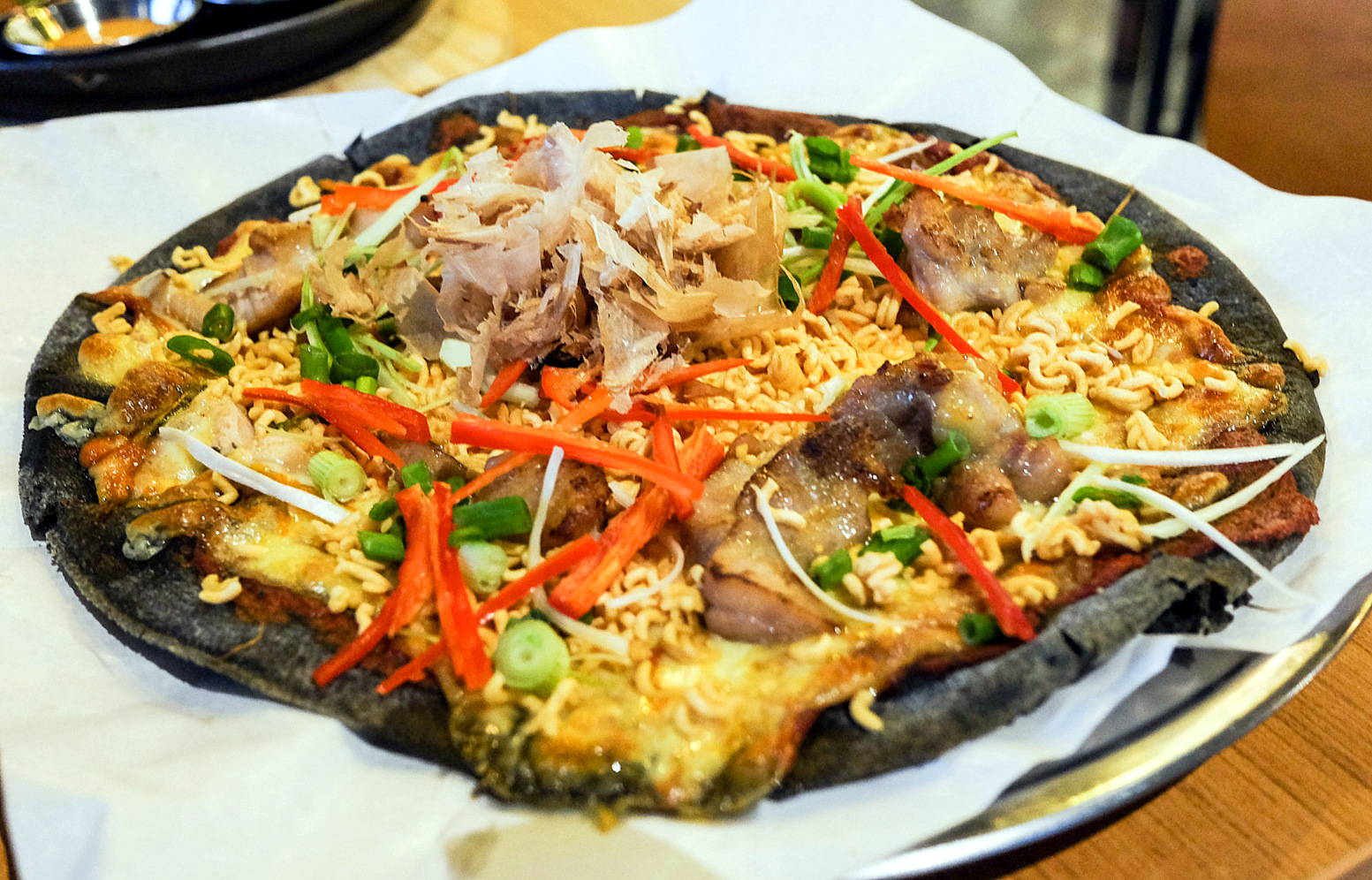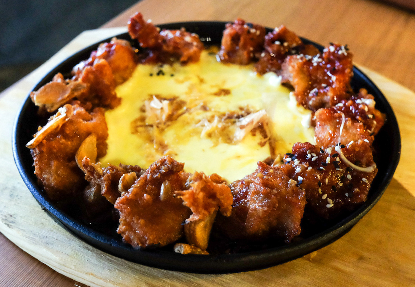 Customers with an aversion to cheese may find their taste buds short-circuiting if they order the mozzarella-rich boneless garlic soy chicken wings (RM25) or the pizza topped with chicken, chives, crunchy ramyun noodles & hot pepper paste sauce (RM28); it may be necessary to recharge with a soju-flamed brownie (RM35) or cool cocktails with bases of soju & makgeolli, some showcasing surprising Korean-inspired ingredients like corn silk tea, a galbi marinade, & even noodles (RM25-RM35).